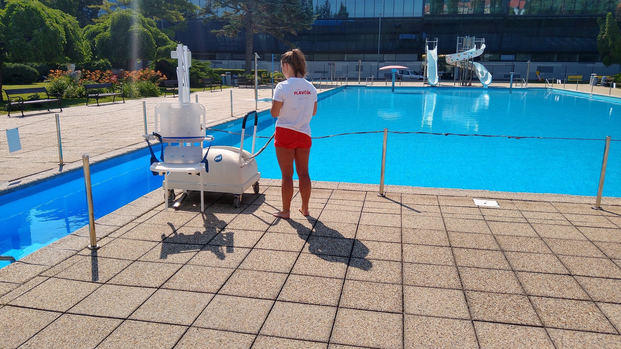 Bazénový zdvihák pre imobilných obslúži plavčík či plavčíčka.
