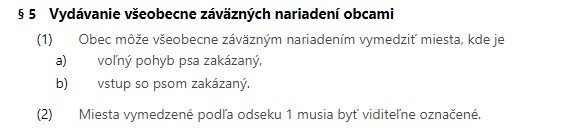 No ako je to s voľným pohybom psov mimo upravených výbehov? Pravidlá určuje zákon 282/2002, ktorým sa upravujú niektoré podmienky držania psov. Zo zákona vyplýva, že obec nesmie vo všeobecne záväznom nariadení určovať miesta, kde je voľný pohyb psa dovolený (ako sa to niekedy z nevedomosti v obciach deje), ale naopak, smie vymedziť iba miesta, kde je voľný pohyb psa zakázaný. Takéto miesta musí navyše viditeľne označiť. Aj mestskí policajti zvyknú napomínať psíčkarov za pustených psov mimo výbehu. Podľa zákona však musí byť miesto, kde psa nemôžete pustiť navoľno, viditeľne označené. Teda všade, kde nie je viditeľne označený zákaz, môže byť pes pustený, keďže zákon je nadradený všeobecne záväzným nariadeniam.