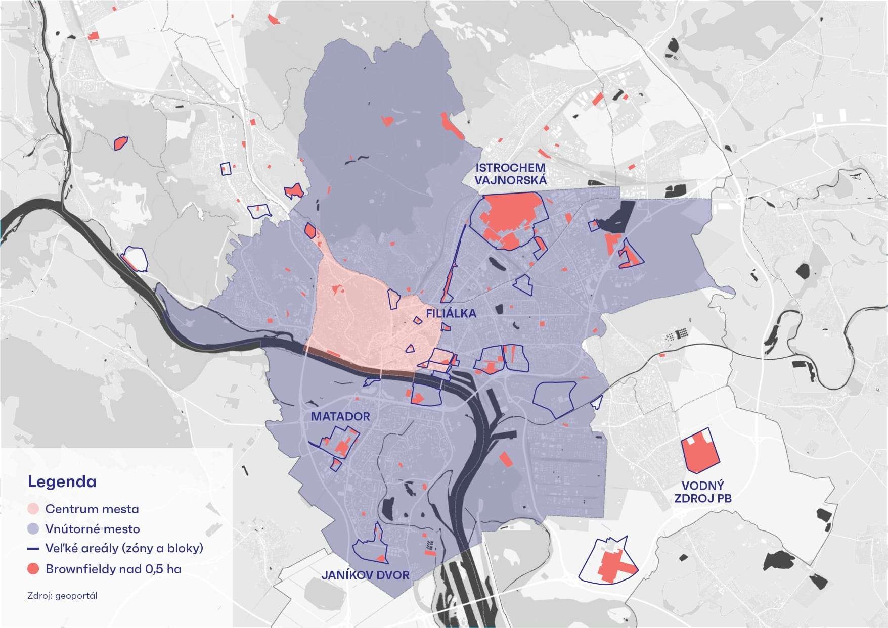 Dáta ukázali, že najviac nevyužívaných území sa nachádza v mestskej časti Nové Mesto, kde nájdeme brownfieldy ako Istrochem, Filiálka či štadión Mierová kolónia. Tým, že pri brownfieldoch ide často o bývalé priemyselné areály, ich limitom býva environmentálna záťaž, ktorá tvorí tretinu výmery všetkých brownfieldov.
