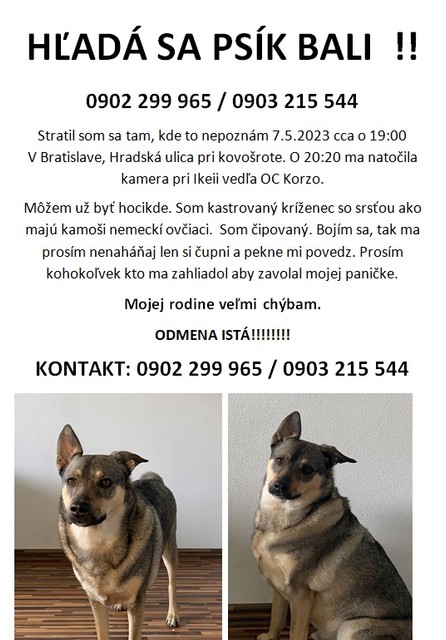 Ak o psíkovi čokoľvek viete, môžete zavolať jeho majiteľom na 0902 299 965 alebo na 0903 215 544, prípadne napíšte do Bratislavských novín na redakcia@banoviny.sk, do predmetu mailu uveďte Bali.
