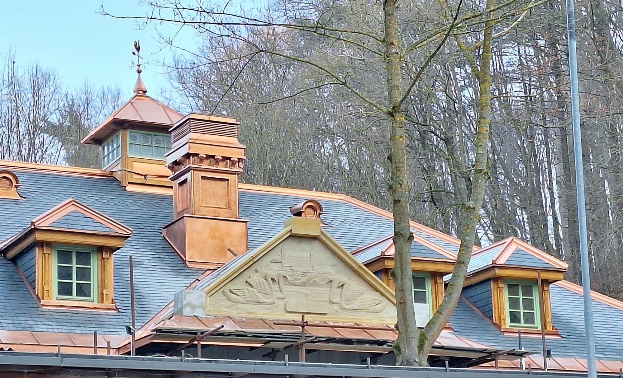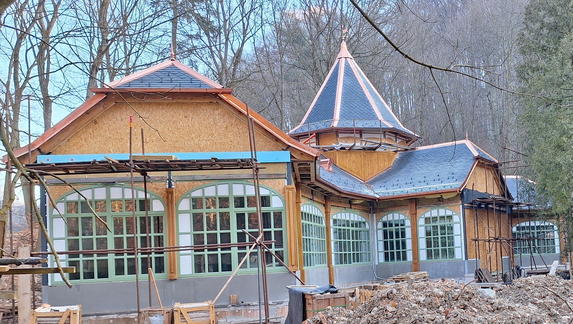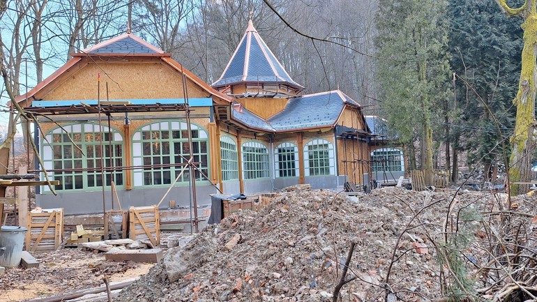 Novostavba záhradnej reštaurácie v čarovnom prostredí lesoparku stojí na mieste niekdajších Ferdinandových kúpeľov z roku 1828 (zbúrali ich v roku 1970), rovnako replika Labutieho pavilónu s vežou je na mieste pôvodného historického objektu. Oba stavia rodinná firma podnikateľa a politika Alojza Hlinu, ktorý sa rozhodol pomenovať jedno krídlo Labutieho pavilónu Dorothea wing a druhé Theresia wing – tak o tom informuje na sociálnej sieti.