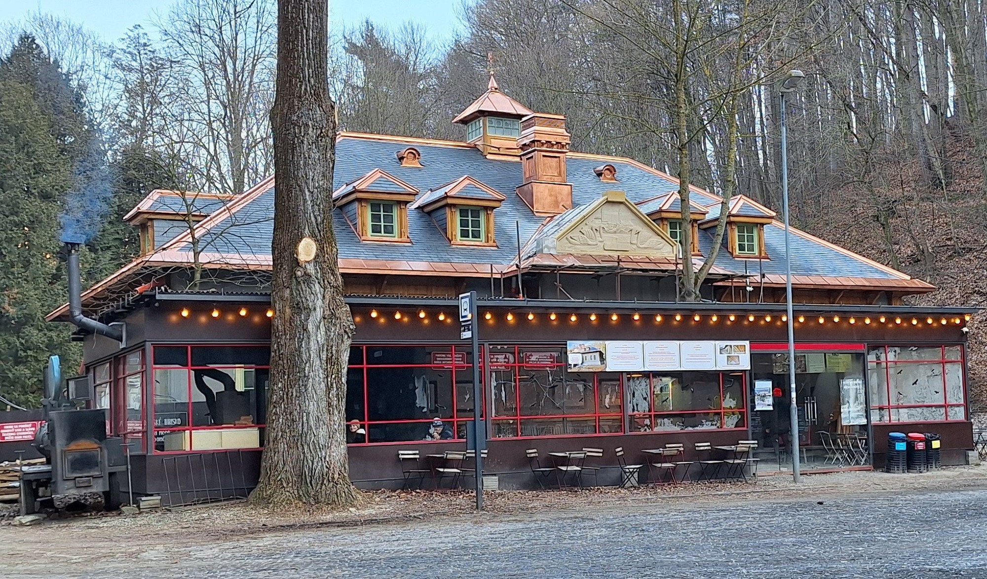 Záhradná reštaurácia (za bufetom) stojí na mieste niekdajších Ferdinandových kúpeľov.