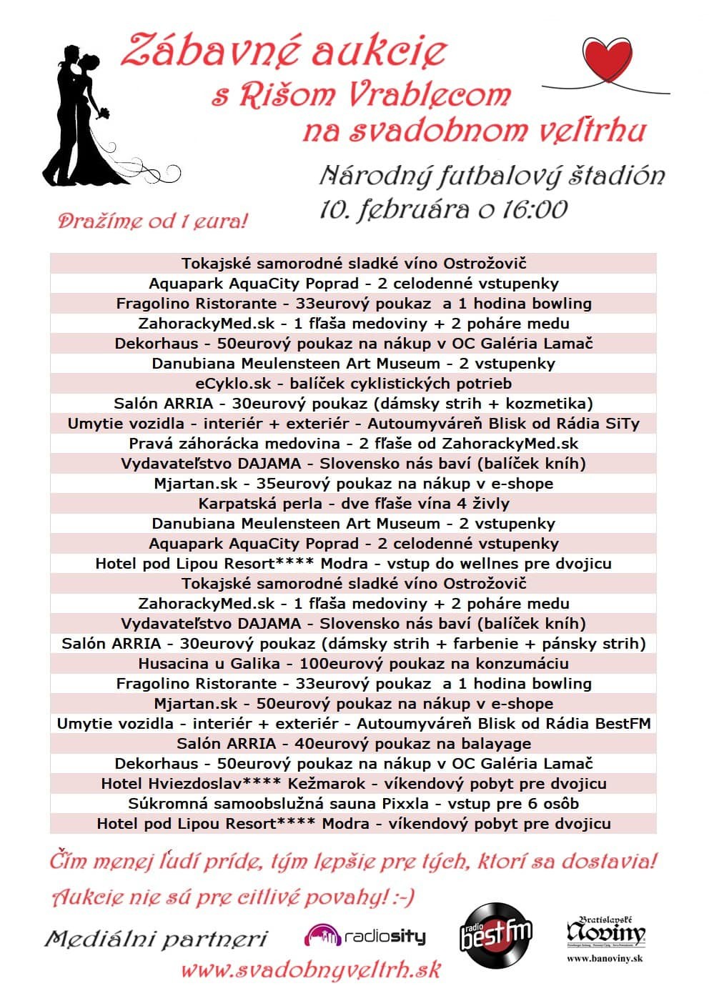 Ak zavítate v sobotu 10. februára na Svadobný veľtrh na Národnom futbalovom štadióne, nevynechajte zábavnú dražbu, ktorú moderuje obľúbený Richard Vrablec. Zaujímavé produkty sa dražia v cene už od jedného eura. Aukcia sa začína o 16:00 h a potrvá hodinu.
