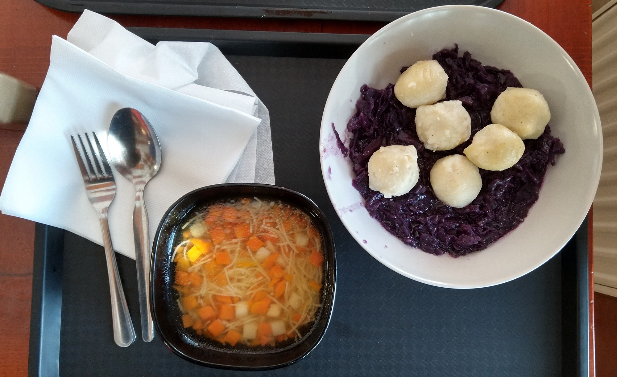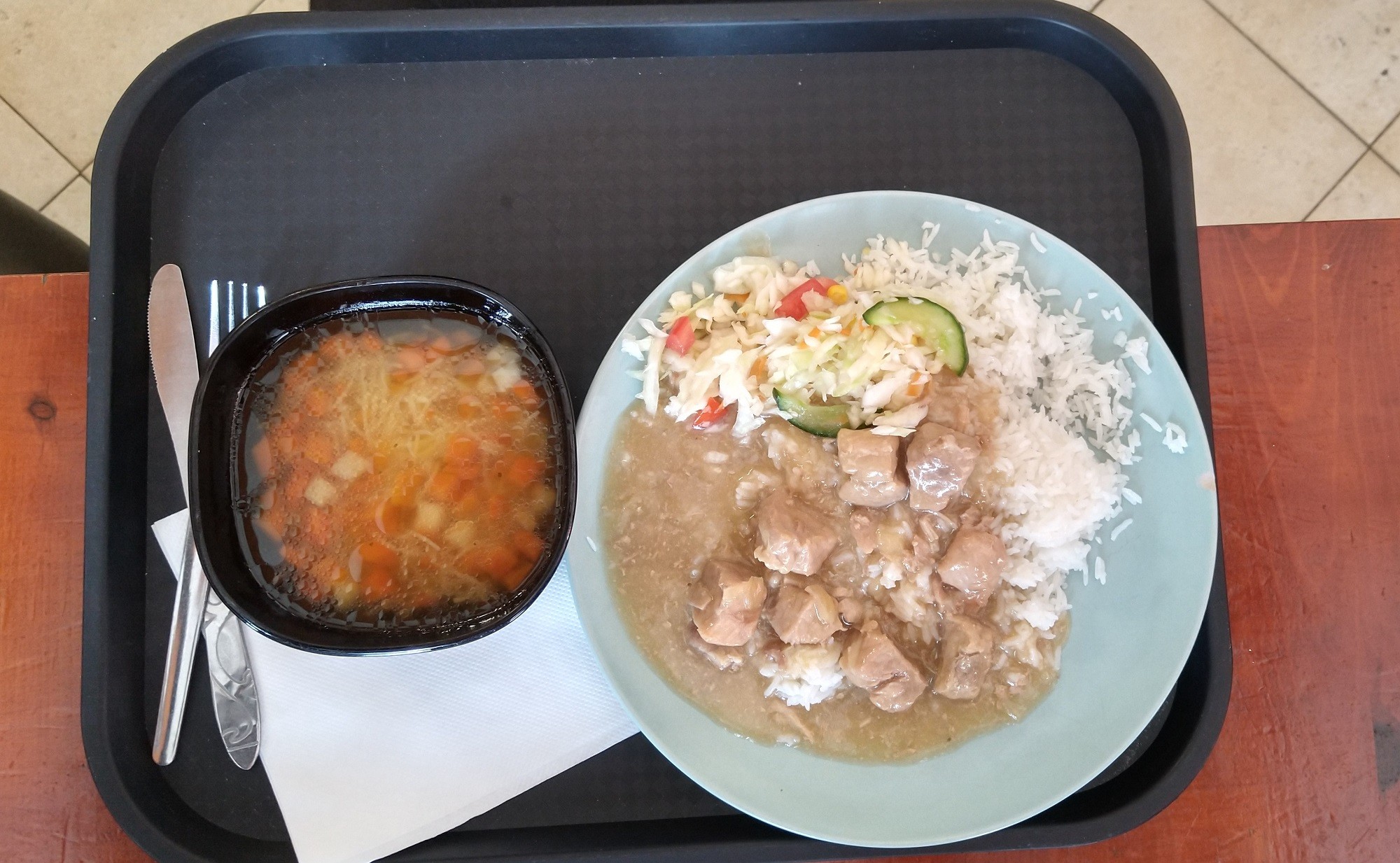 Z dvoch polievok, ktoré boli v ponuke v deň našej návštevy, sme stavili na Kurací vývar s rezancami (0,60 €), ďalšou možnosťou bola šošovicová na kyslo. Vývar milo prekvapil, chuťovo patril k tým lepším. Celkom silná a hustá polievka bola dokonca horúca, čo nezažijete všade, aj v lepších reštauráciách nám ju občas priniesli vlažnú. Takže chválime.