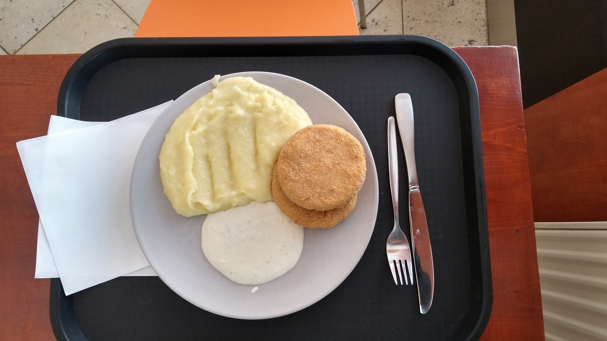 Vyprážaný encián (6,10 €) sme si dali so zemiakovou kašou (zemiakov v rôznych podobách mali viac) a ako alternatívu k zelenine sme zvolili tatársku omáčku. Zemiaková kaša bola pripravená poctivo, žiaden polotovar, pre nás síce málo slaná, ale jediteľná, nemali sme vážnejšie výhrady. Inak, na stoloch sú soľničky aj koreničky. Vyprážaný encián podľa nás čerstvý nebol, z trojobalu sme mali pocit, že syr bol v strúhanke obalený znova, ale jedli sme už aj horšie. Tatárska omáčka, asi vlastnej výroby, bola celkom dobrá, ale jedli sme už aj lepšie. No a porcia veľká, syry až dva, to sa bežne nevidí. Servírovanie síce nič moc (tatárska „placnutá“ rovno na tanier), nuž ale, to je táckareň.