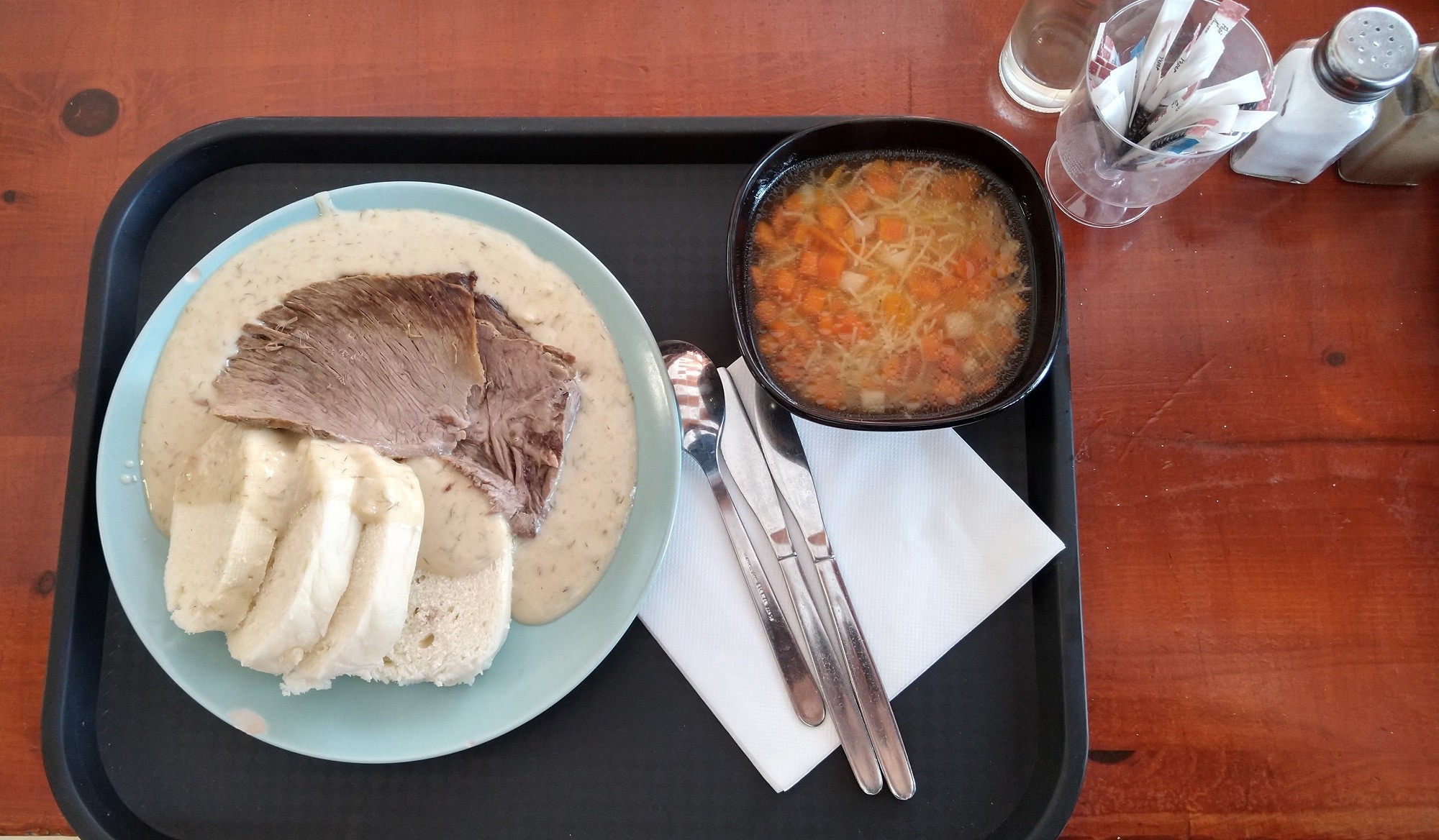 Ďalšou našou voľbou bolo Hovädzie varené s kôprovou omáčkou a knedľou (6,10 €). Na tanier nám naložili celkom peknú porciu, ktorá potešila oko. Samotné mäsko bolo síce trochu suchšie, ale spolu s omáčkou fajn. Knedľa zas ľahká, hebká aj po nejakom čase, čo sa nám žiada vyzdvihnúť – jednoznačne bola domácej výroby.