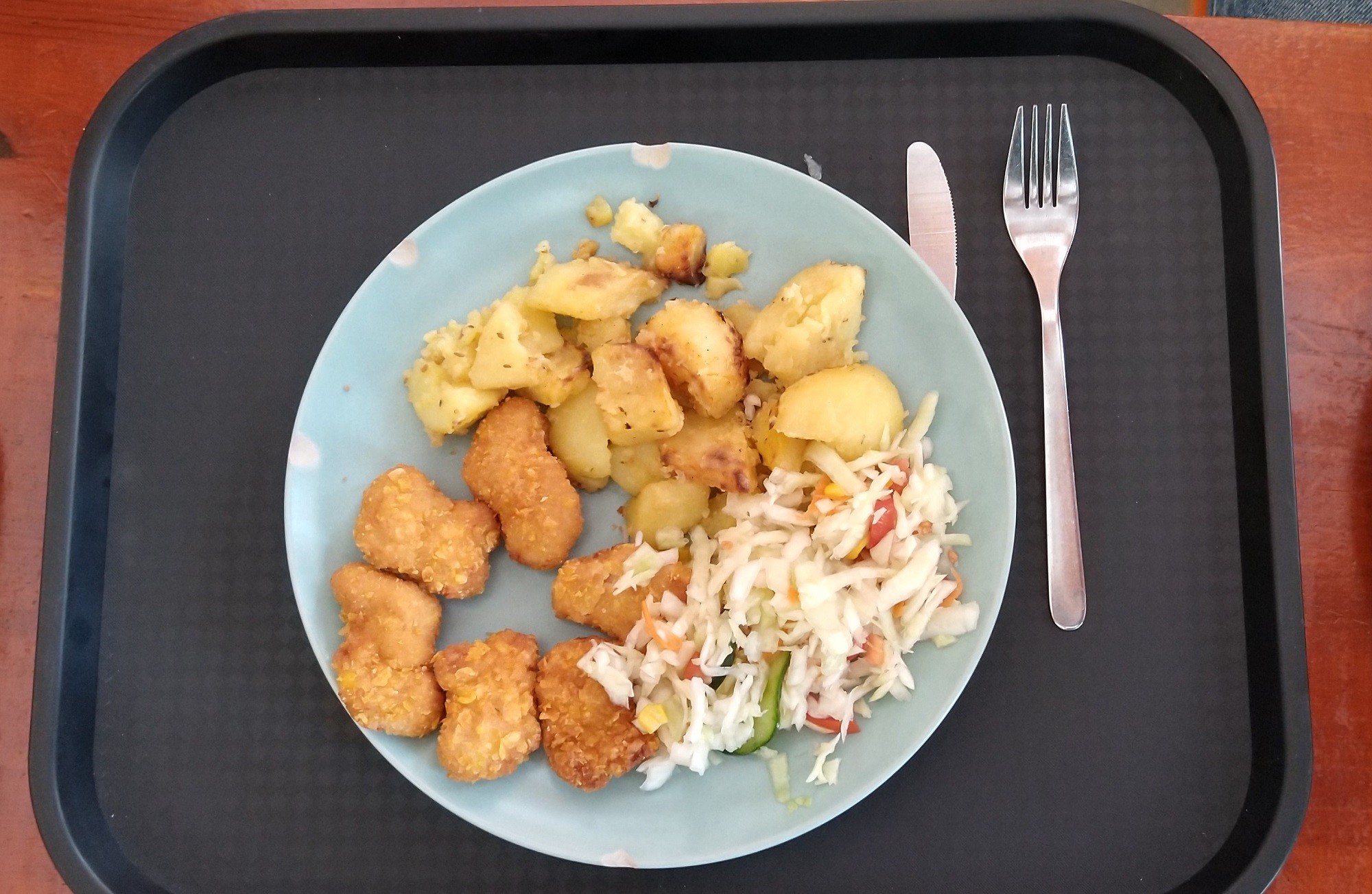 K vyprážaným kuracím nugetám sme si zas vybrali opekané zemiaky a kapustový šalát, ktorý nám pripomenul dávne časy školských jedální, taká milá spomienka. Mäsu nevyčítame nič, bolo chutné (a teplé!), fajn boli aj zemiaky, kôrka jemne chrumkavá, naša obava, že budú medzi nimi tvrdé spečené kusy, bola zbytočná. Na šaláte sme ocenili, že bol čerstvý a mal neupravenú, prirodzenú chuť bez nálevu.
