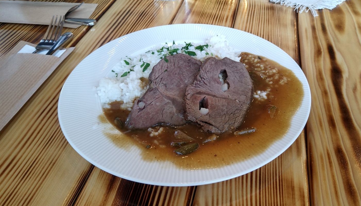Nesklamala ani Znojemská hovädzia pečienka s dusenou ryžou (8,50 €). Mäso preťahované slaninkou bolo výborné, jemné, omáčka poctivá, plnej chuti, kyslé uhorky jej dodali správny šmrnc. Konečne sme mali aj dobre uvarenú ryžu – sypkú, nadýchanú, ale zároveň jemne lepivú, našu predstavu splnila dokonale. Veľkosť porcie síce nebola taká, že by sme sa po jedle nevládali zdvihnúť od stola, ale na minimálne trojhodinové zasýtenie stačila.