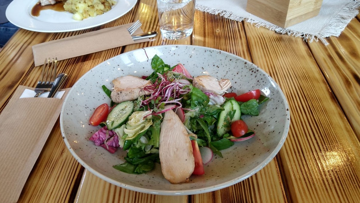 V týždennom menu bol tiež Šalát s rajčinami a s grilovaným kuraťom (9,90 €), ktorý robia aj vo „vege“ verzii s grilovaným syrom. Plátky kuracích pŕs chutili skvele, boli šťavnaté, jemné a dobre ochutené, v kombinácii s čerstvou zeleninou to bola ďalšia príjemná skúsenosť. Vo veľkej miske sme mali okrem rajčín všeličo iné, potešili najmä svieže plátky šalátovej uhorky a hromada zdravých zelených listov. Vynikajúca bola zálievka, ktorá vyzdvihla toto ľahké jedlo veľmi vysoko. Cítili sme v nej niečo cesnakovejšie aj niečo pikantnejšie, v tom mixe chutí sme sa strácali... Pointa je, že šalát bol bezchybný, nič sa nám nežiadalo doplniť, a porcia na prekvapenie úplne postačovala, najmä v horúcich dňoch pokojne nahradí obed.