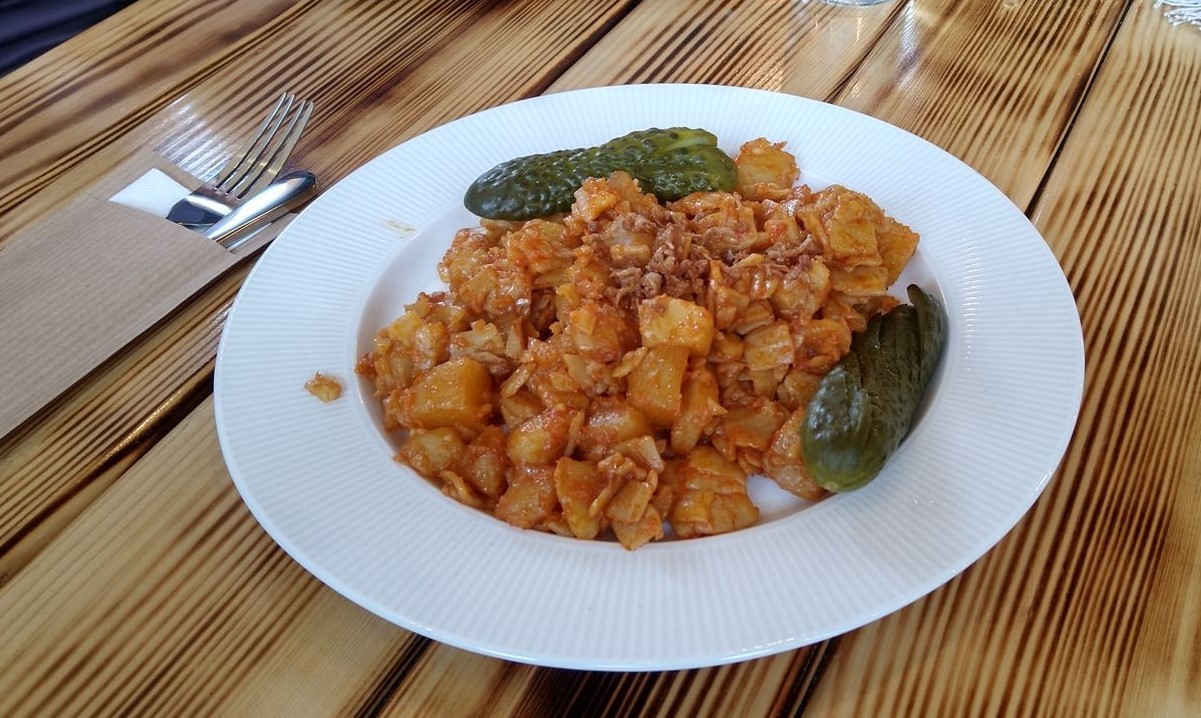 Druhou voľbou z denného menu bol Granadír (8,50 €), podávaný tradične s kyslou uhorkou. Vďaka sýtym farbám vyzeral už na pohľad chutne, čo sa potvrdilo i pri jeho konzumácii. Pri tomto jedle máme pocit, že na ňom niet čo pokaziť, ale možno predsa – napríklad v ňom budú rozvarené cestoviny alebo nedovarené zemiaky... To sa v našom prípade nestalo, granadír nám dokonca ešte „apgrejdli“ chrumkavou opraženou cibuľkou. Bežnému ľudovému jedlu dodala novú, skvelú chuť, a bol to teda zážitok.