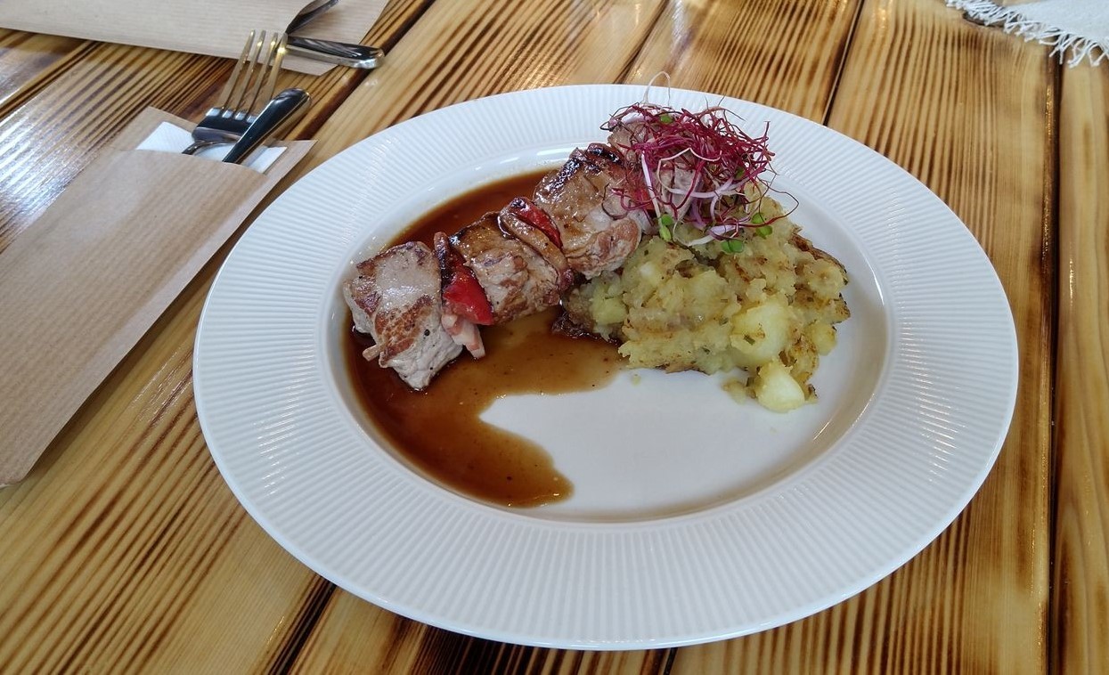Nám už v predstihu urobila chuť ponuka jedálneho lístka, zverejnená na webe reštaurácie - bryndzové halušky so slaninkou, pirohy s údenými zemiakmi a bryndzou, viedenský teľací rezeň, sviečková na smotane... Tešili sme sa však predčasne. Ponáhľali sme sa sem totiž začiatkom apríla, krátko po otvorení, keď sme si mohli vyberať len z denného menu a týždenného špeciálu. Napriek obmedzenej ponuke jedlo potešilo, ocenili sme tiež efektné servírovanie aj expresne rýchly a milý personál.