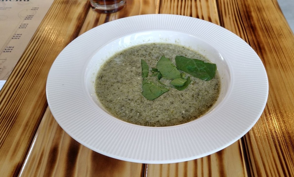 Najskôr sme vyskúšali Špenátovú polievku (1.90 €), ozdobenú mladými lístkami. Chutila výborne, aj keď niekomu možno viac vyhovuje o niečo hustejšia a zelenšia verzia. Mala zaujímavý, jemne kyslý záver, skrátka, trochu iný štýl, ale chválime. Dochutenie i konzistencia polievky boli tak akurát.