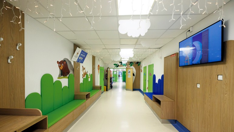 Modernizácia zahŕňala komplexné riešenie priestoru s dôrazom na funkčnosť a estetiku. Súčasťou projektu bola inštalácia na mieru vyrobeného nábytku, drevených obkladov a dekorácií na stenách, ale aj špeciálne navrhnutého prebaľovacieho pultu a pohodlných lavíc. Všetky použité materiály spĺňajú najvyššie štandardy kvality a odolnosti, ktoré sú v nemocničnom prostredí nevyhnutné.