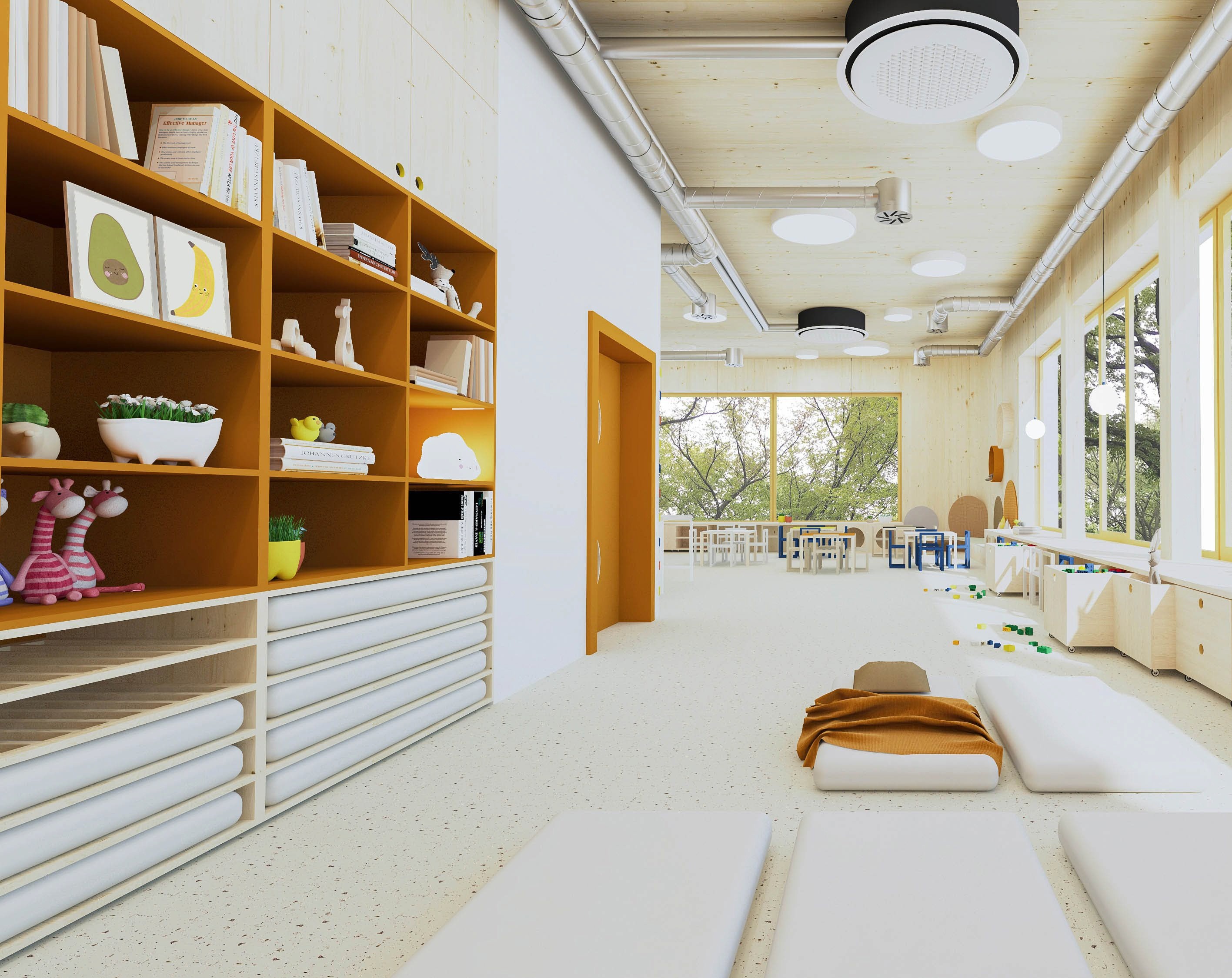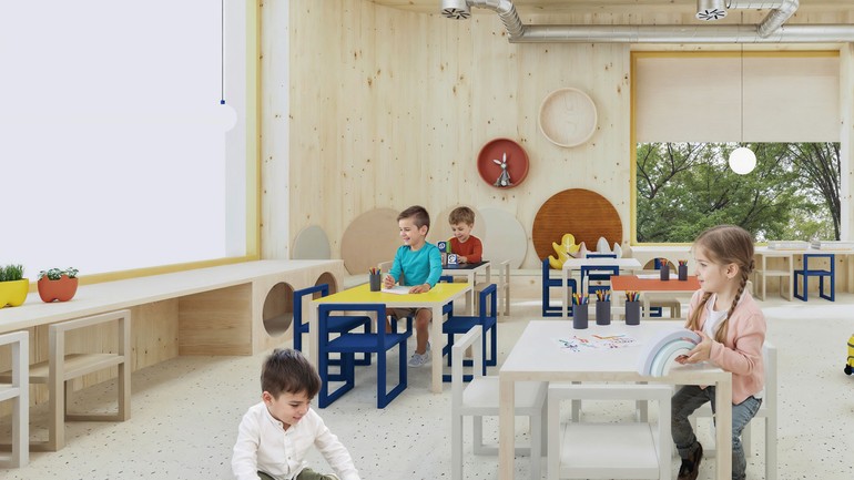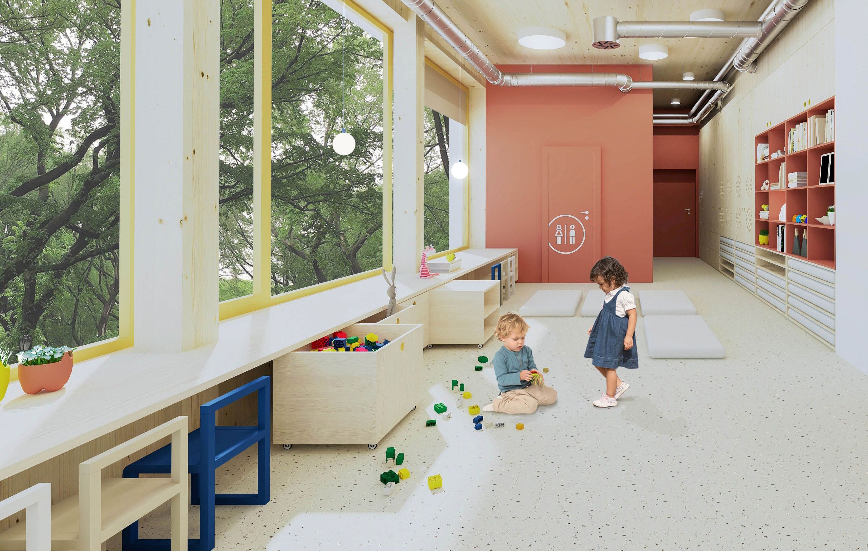 Súčasťou najpredávanejšieho a zároveň najzelenšieho projektu z dielne JTRE bude moderná a trvalo udržateľná materská škola. „Aj táto budova, rovnako ako aj celý projekt Downtown Yards, prešla kompletným prerodom. Z pôvodnej železobetónovej budovy sme pre deti navrhli hybridnú konštrukciu, s prírodným dreveným interiérom, zelenou strechou a podnetným detským ihriskom,“ opisuje Pavel Pelikán, výkonný riaditeľ JTRE a dodáva, že práve vďaka využitiu vyspelých technológií s dôrazom na energetickú efektívnosť bolo možné minimalizovať zabudovanú uhlíkovú stopu v použitých materiáloch cca o 90% podľa hodnotenia LCA. Zmena sa realizovala v spolupráci s architektonickým ateliérom Domesi Slovensko, ktorého projekt tento rok získal ocenenie Stavba roka 2024.