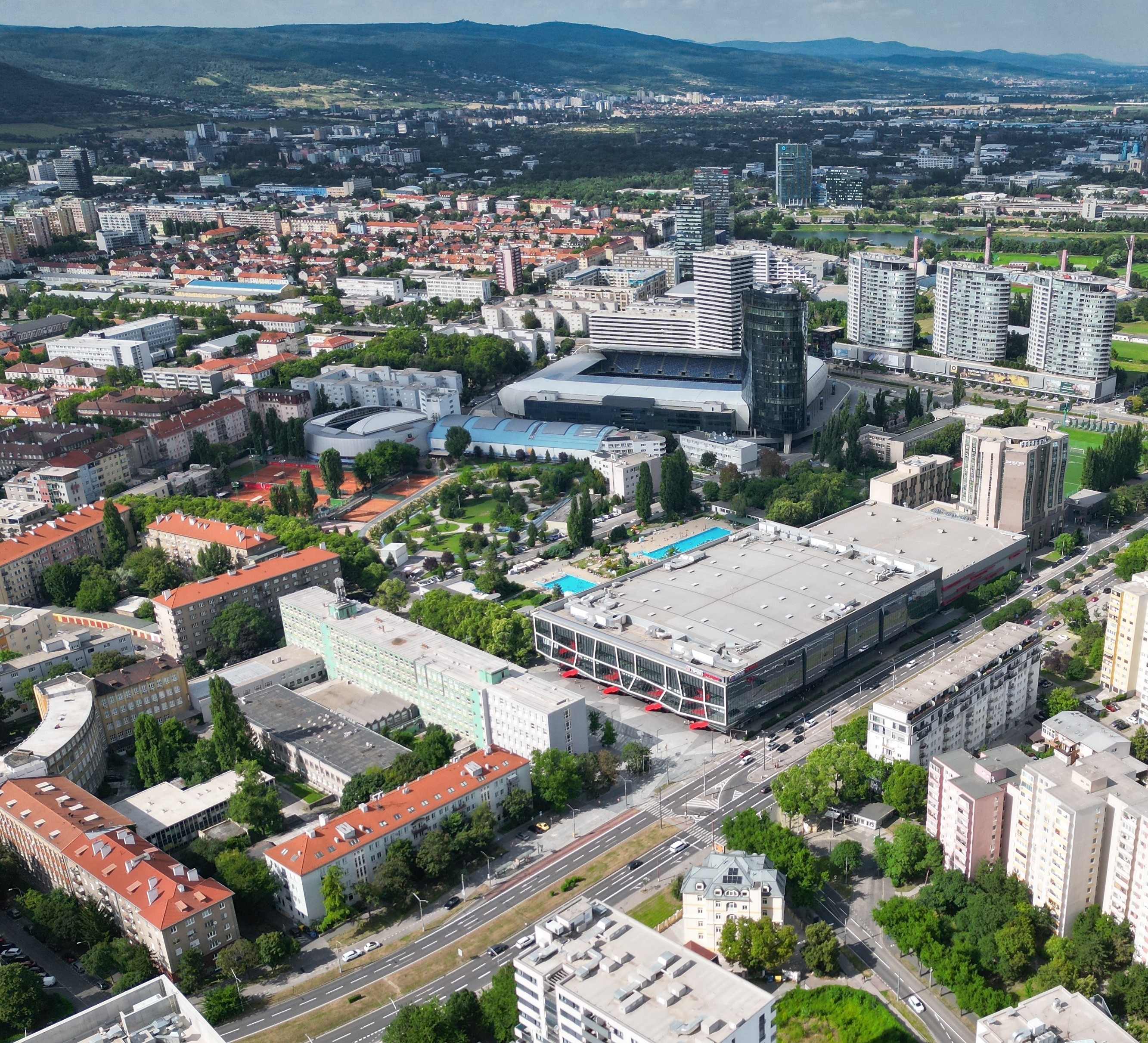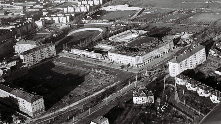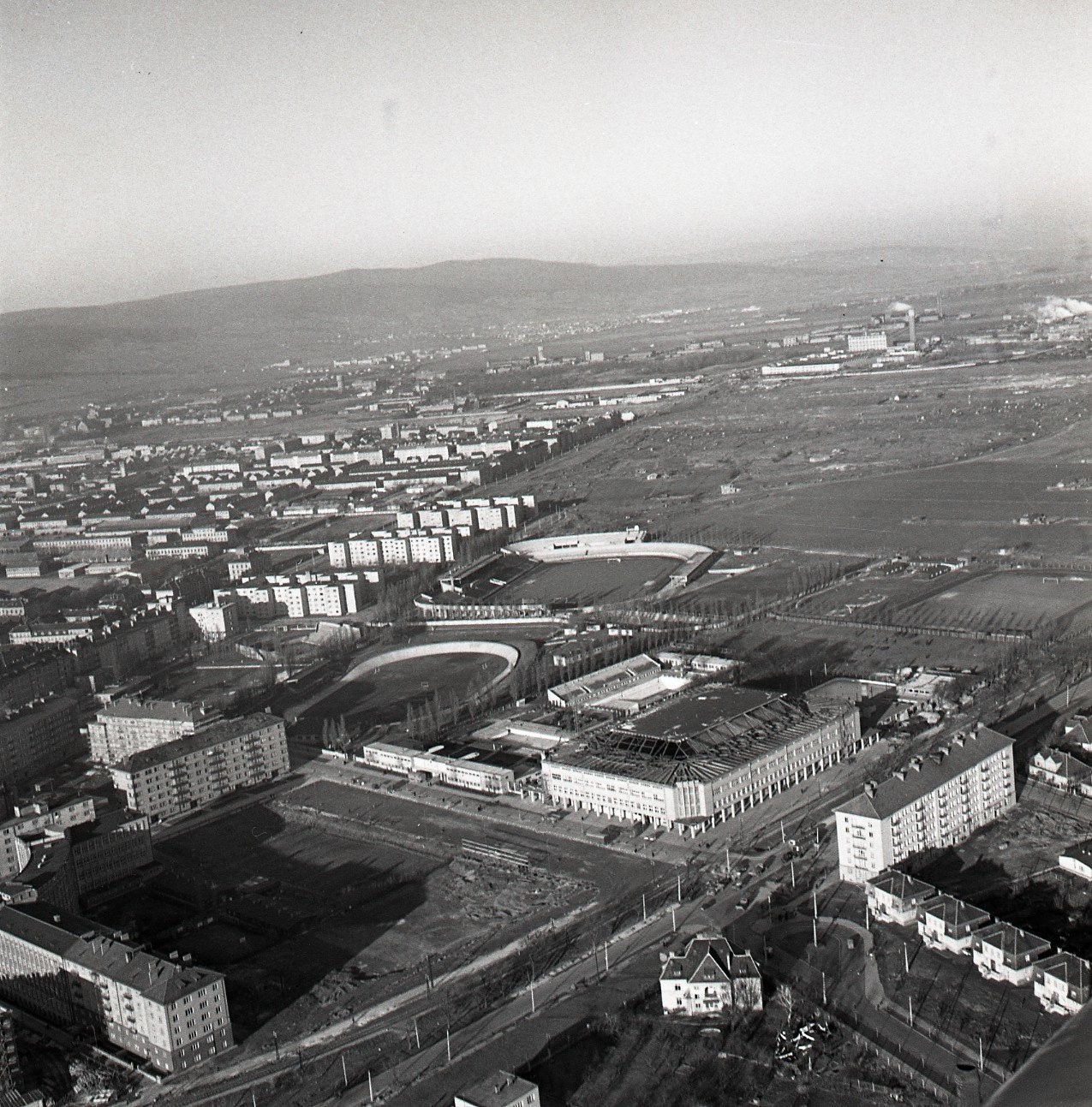 Dobová fotografia z 23. januára 1958 ponúka pohľad na športovú štvrť nášho mesta – hokejový, futbalový a cyklistický štadión aj kúpalisko Tehelné pole. Vynovený Zimný štadión uprostred záberu bol v tom roku dejiskom Majstrovstiev Európy v krasokorčuľovaní, kedy náš reprezentant, 22-ročný Karol Divín, získal prvé európske zlato. Kúsok od štadióna viedla vtedy popri Trnavskej ceste trať Zadunajskej železnice smerujúcej do Komárna.