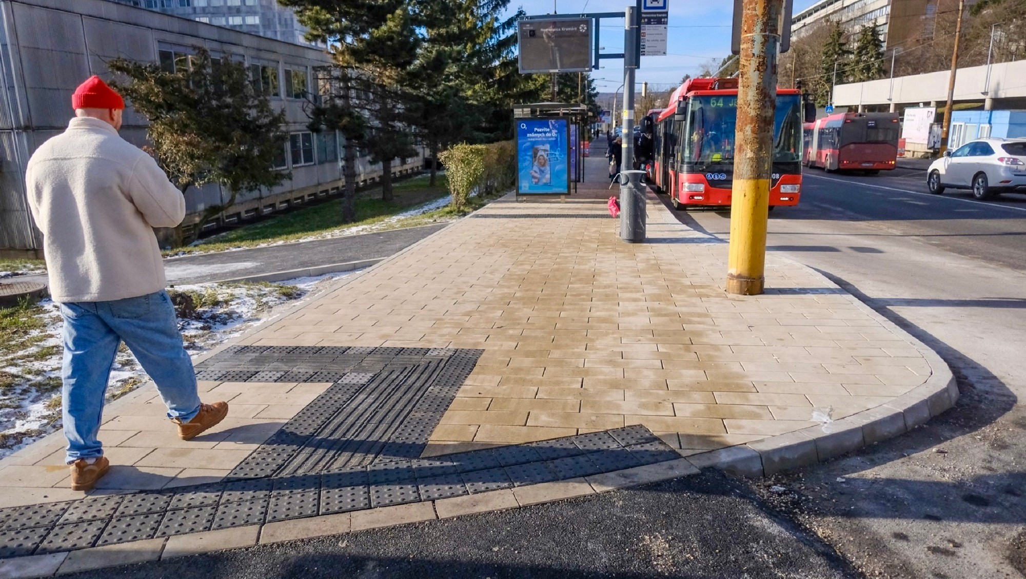 Zastávka MHD pred nemocnicou na KramárochĎalšia drobná zmena k lepšiemu. Na Limbovej ulici v bratislavskom Novom Meste, konkrétne pred Nemocnicou Kramáre, skultivovali priestor ďalšej zastávky MHD i priľahlý chodník.