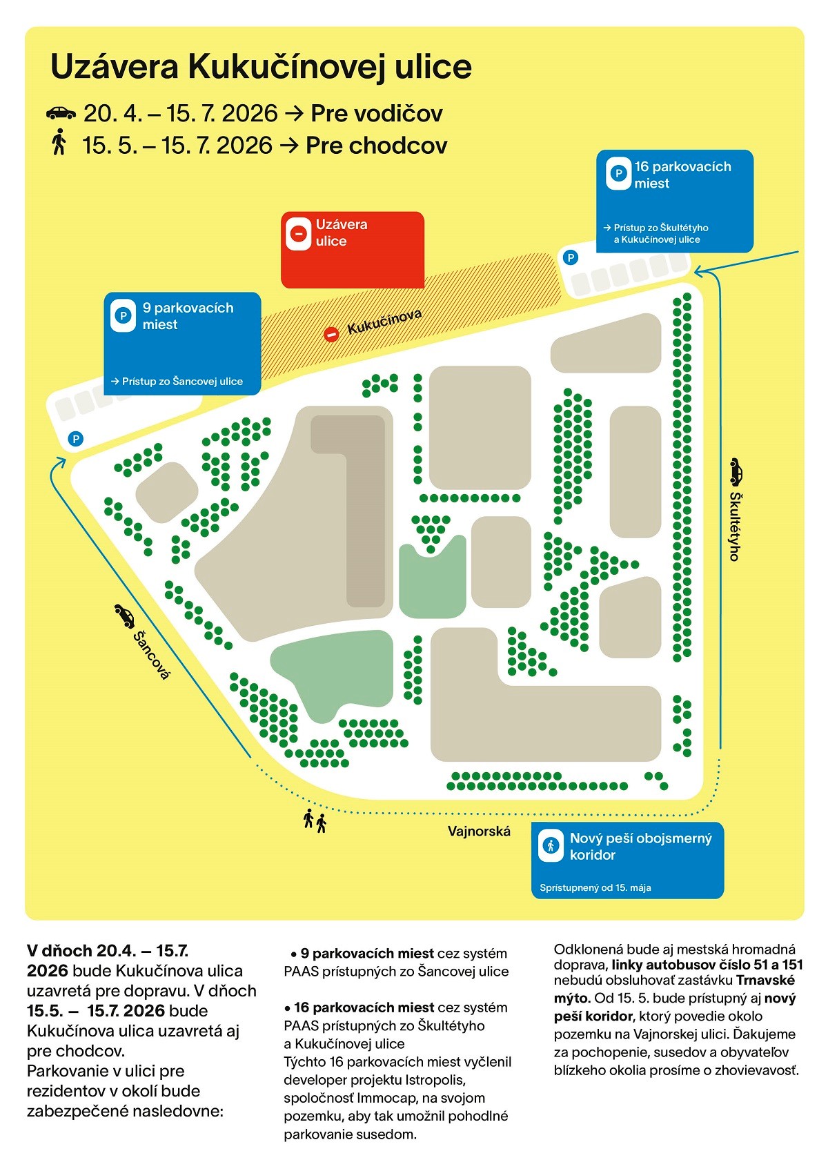 Od 20. apríla do 15. júla bude uzatvorená Kukučínova ulica pre dopravu, od 15. mája aj pre chodcov. Od polovice mája však má byť okolo pozemku prístupný nový peší koridor na Vajnorskej ulici.