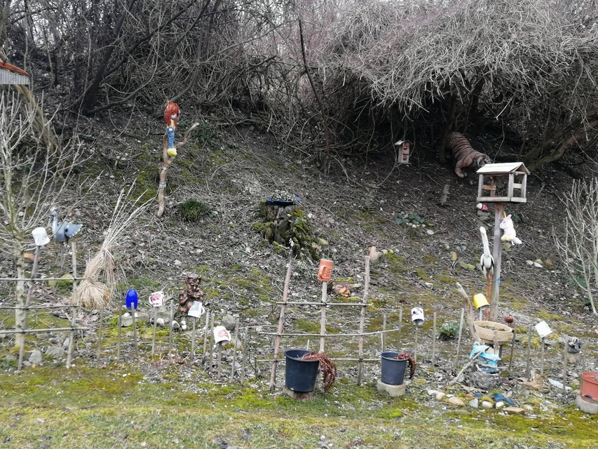 Celá záhrada bola ohradená navôkol drevenými palicami, ktoré tvoria akýsi plot. Na koncoch každej palice boli rôzne hrnčeky, nádoby, hrnce či misky. Na rôznych miestach záhrady sa nachádzajú plyšové hračky, ktoré dotvárajú celkovú atmosféru miesta. Nechýba napríklad tiger zakrádajúci sa z lesíka, trpaslíci, kýbliky, búdka na kŕmenie vtáčikov a mnohé iné. Musí sa uznať, že je za tým cítiť kus nápaditosti, citu pre vkus a kreativity.