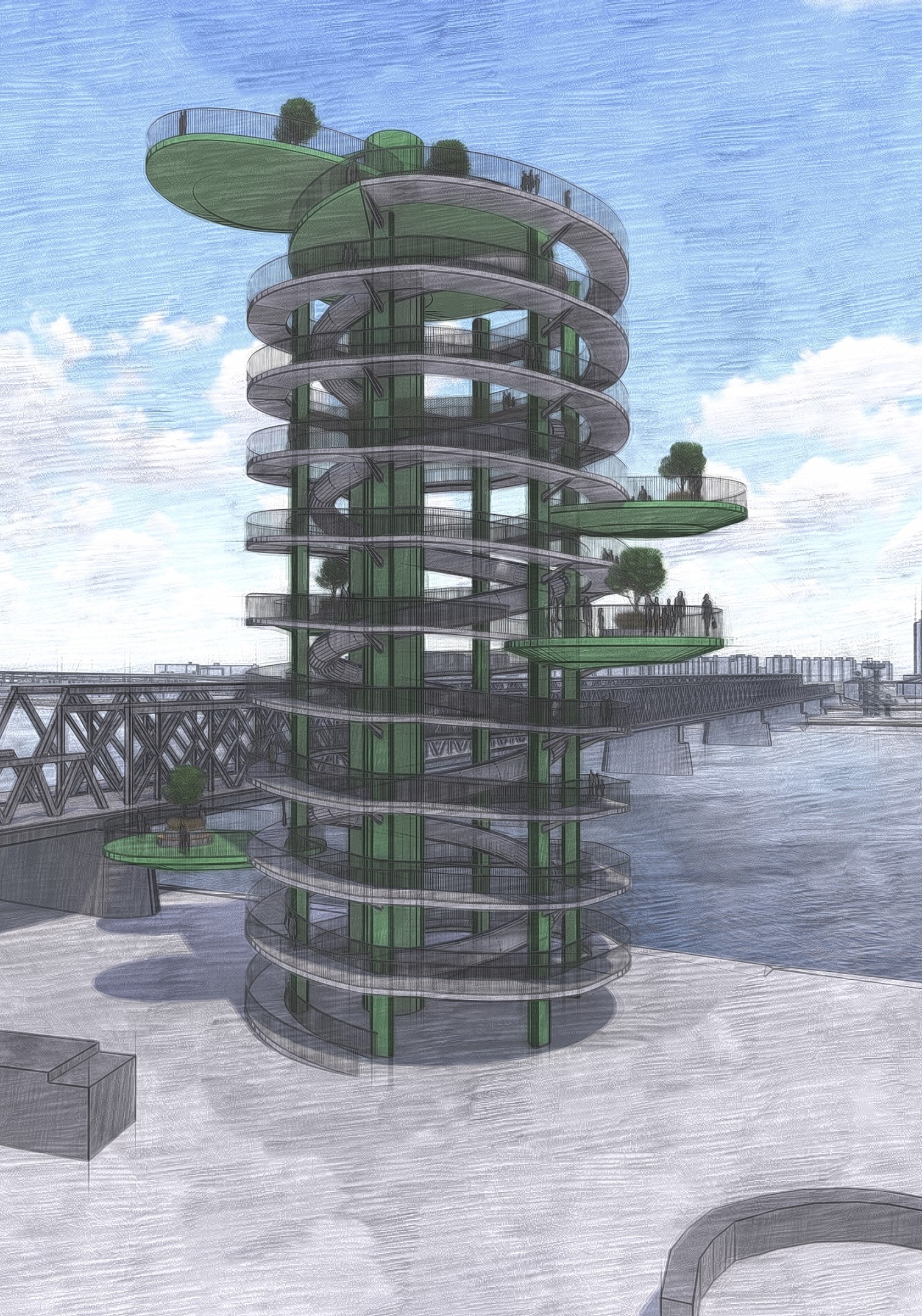 Projekt sa vyvíjal a ovplyvnil ho aj úspech chodníkov v korunách stromov, ktoré ste možno navštívili v Bachledovej doline alebo v Bojniciach. „Skombinovať zipline s vyhliadkovou vežou, kde by bola vo vnútri aj šmykľavka pre deti, nás nadchlo,“ pokračuje Juraj Fandel a spomína, ako bola v hre okrem zipline napríklad aj adrenalínová sklená vysunutá lávka. Pokračuje tvrdením, že vyhliadková veža v meste môže mať aj druhý plán, a to vtedy, keď bude jej súčasťou predstavenie krás Slovenska. „Ročne máme v Bratislave vyše milióna turistov. Náučný chodník do vyhliadkovej veže alebo galéria s fotografiami Slovenska by ich mohli motivovať k tomu, aby sa v našej krajine zdržali o čosi dlhšie a navštívili aj iné miesta ako len Bratislavu.“ To, že by bol medzi nimi záujem už len o samotnú rozhľadňu, ktorá by mala pripomínať vertikálnu záhradu a bola by na nej možnosť posedieť si na vysunutých terasách s výhľadom na promenádu, vôbec nepochybuje.