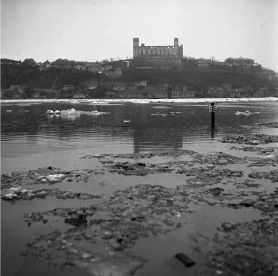 Pohľad z Petržalky na ľadové kryhy v Dunaji, podobu Bratislavského hradu z roku 1946 a dnes už neexistujúce domy na nábreží...
