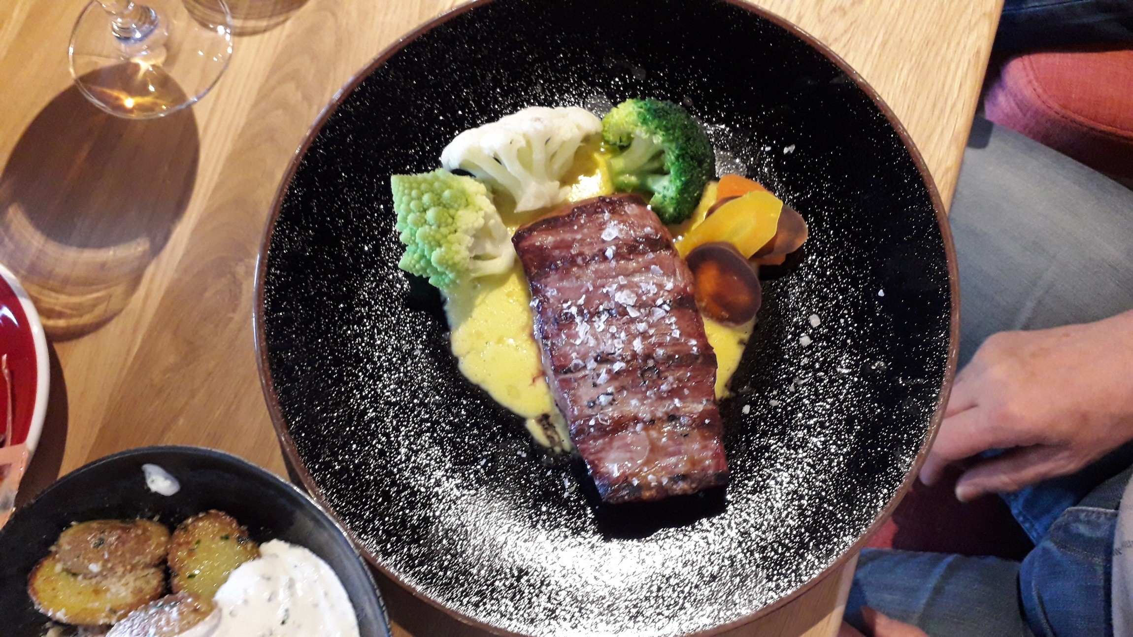 Flank steak (18,90 €) sa pripravuje z mäsa, ktoré pochádza zo spodnej časti hovädzieho pupku, neprekvapilo nás teda, že bol trochu tuhší a tiež mastnejší. K nemu sme mali výbornú dubákovú omáčku s borievkami (2,50 €) a pečené zemiaky s cesnakom, parmezánom a bylinkovou smotanou (2,90 €). Kombinácia dokonalá!