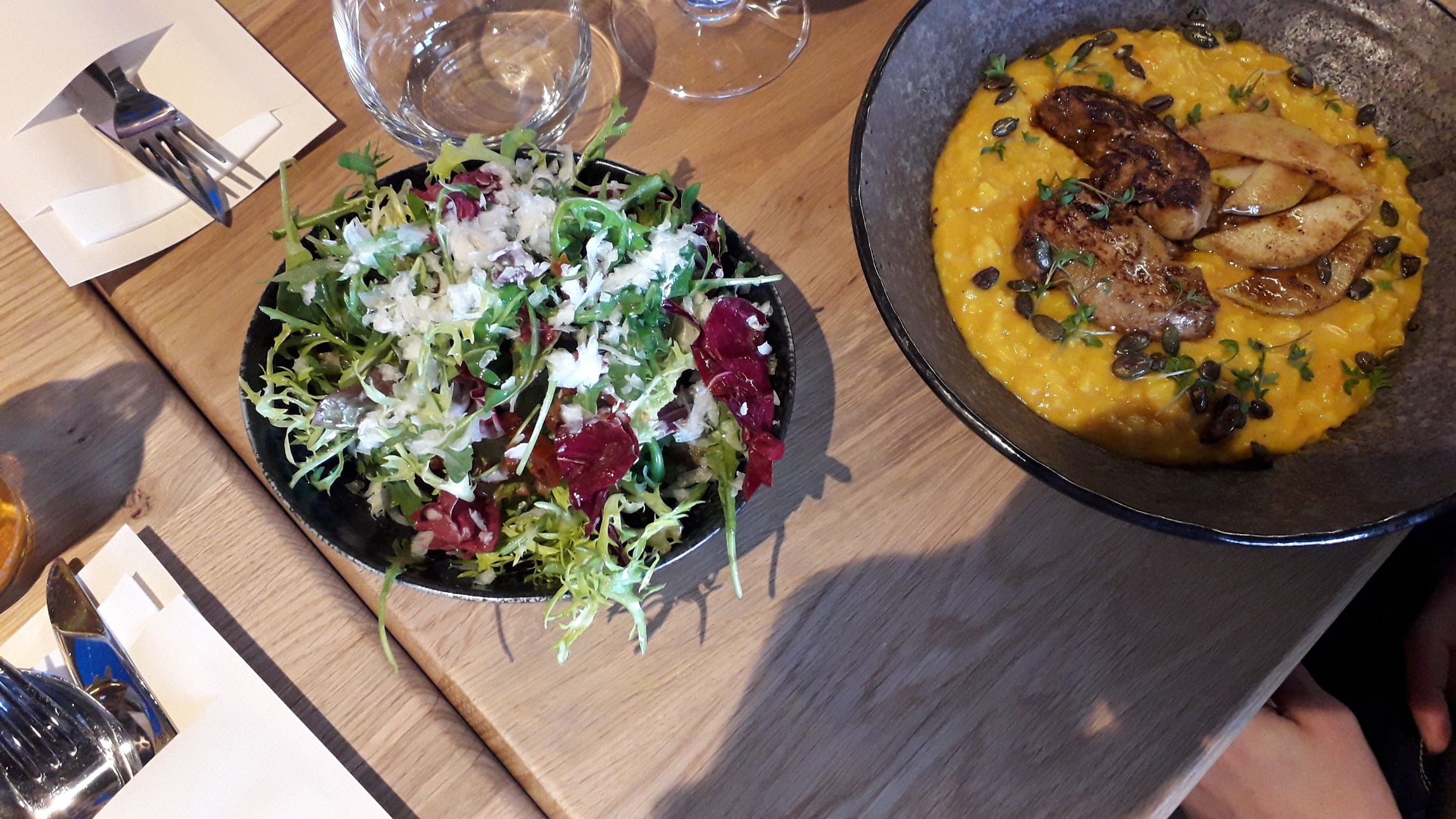 Rizoto z pečenej tekvice (10,90 €) nám naservírovali s kačacou pečeňou a grilovanou hruškou. Bolo lahodné, krémové, i keď trochu slanšie, ako sme zvyknutí. Aj pečeň bola jemná, delikátna. K rizotu sme si navyše objednali šalát so sušenou paradajkou (2,90 €), ktorého základom bola čerstvá listová zelenina. Na pohľad veľmi jednoduchá miska vitamínov nás až prekvapila skvelou chuťou.
