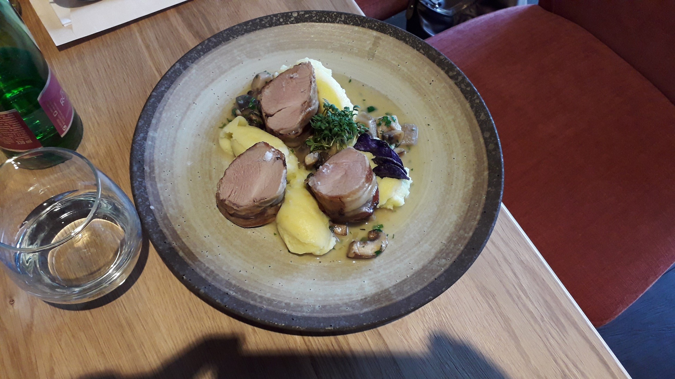 Grilovanú panenku v pancette (13,90 €) nám priniesli so zemiakovým pyré, pečenými hubami a čipsami z fialových zemiakov. Mäso nakrájané na hrubšie valčeky malo vďaka restovanej pancette chrumkavú kôrku a tiež plnšiu chuť. Zemiakové pyré ako príloha bola klasika, zato pečené huby vynikajúce, v kombinácii s diétnejšou panenkou to malo šmrnc. Aj pri hubách sme vnímali slanšiu chuť, ale neprekážala nám.