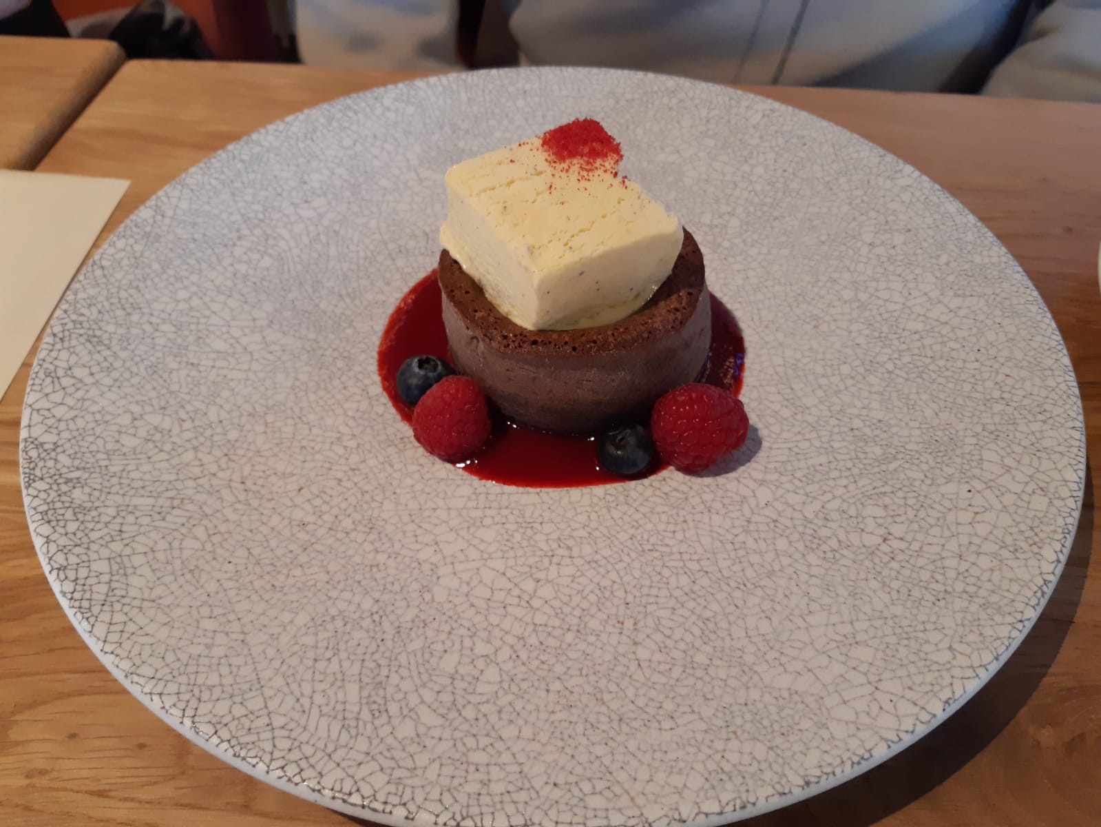Z ponuky troch dezertov sme si vybrali lávový fondant z čokolády Callebaut s malinami a vanilkovou zmrzlinou (4,90 €). Koláčik s topiacou sa zmrzlinou navrchu a kvalitnou tekutou čokoládou vnútri bol vynikajúci.
