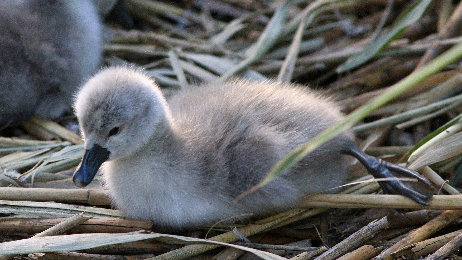 Bezprostredne po vyliahnutí má labuť čiernu farbu peria, ktorá postupne bledne...