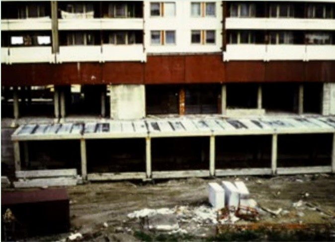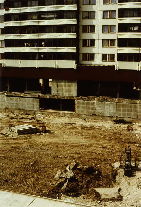 Na fotografii vidno dobudovávanie terás ako nezávislých konštrukcií. Aj na základe tohto faktu sa objavujú názory, že v budúcnosti by sa niektoré staticky nevyhovujúce terasy mohli odstrániť a nahradiť parterom. Zmizol by asociálny priestor pod terasami a nahradilo by ho prepojenie domu, ľudí a ulice prostredníctvom prevádzok, ktoré by na prízemí mohli vzniknúť.