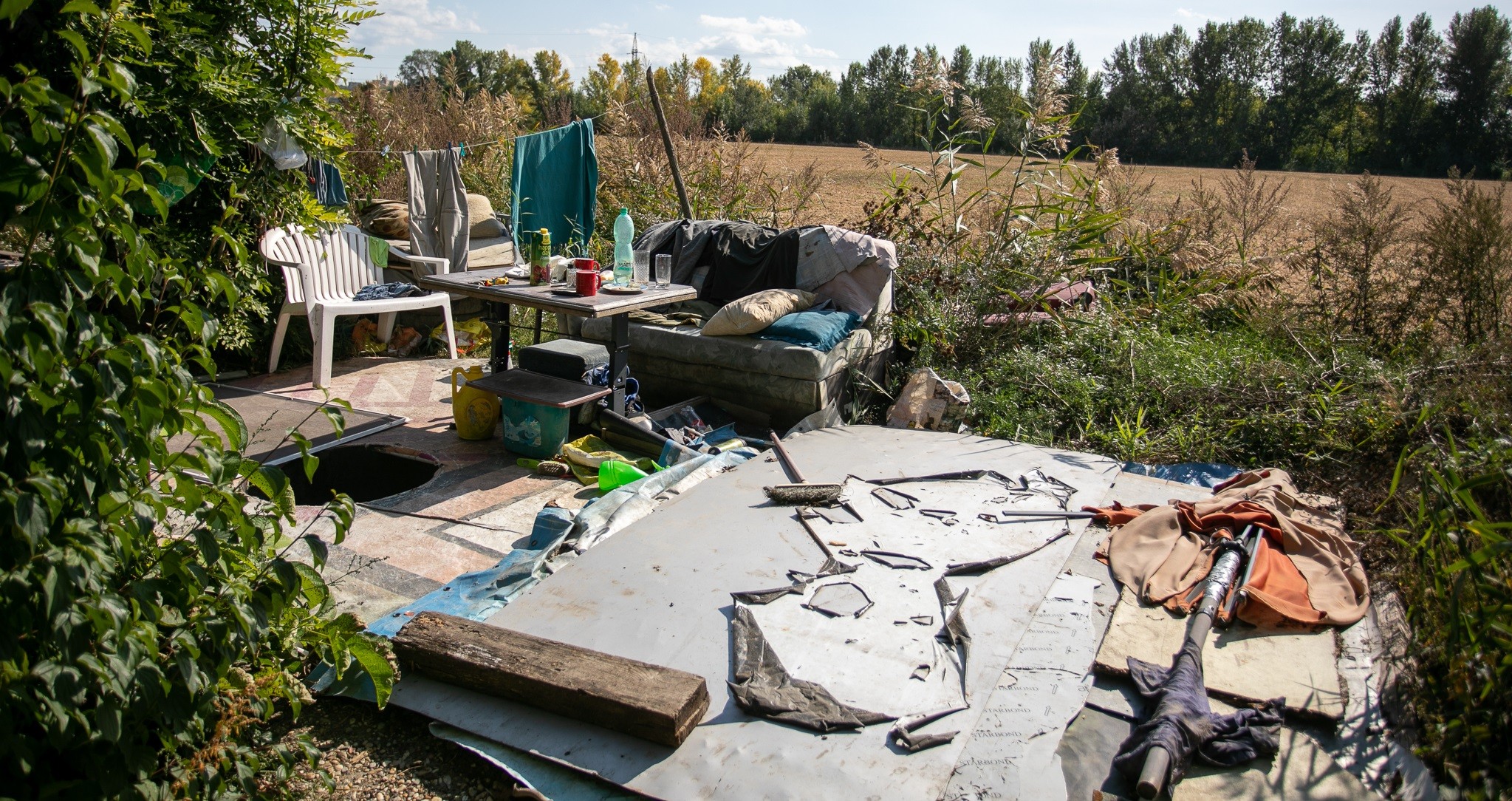 Za domami majú dnes ešte stále obhospodarované pole, uprostred neho už sedem rokov žije Ján. Tiež človek bez domova. Prívetivý 65-ročný pán nám bez problémov ukáže nielen ako žije, ale aj neďaleký bunker zamaskovaný na poli v burine.
