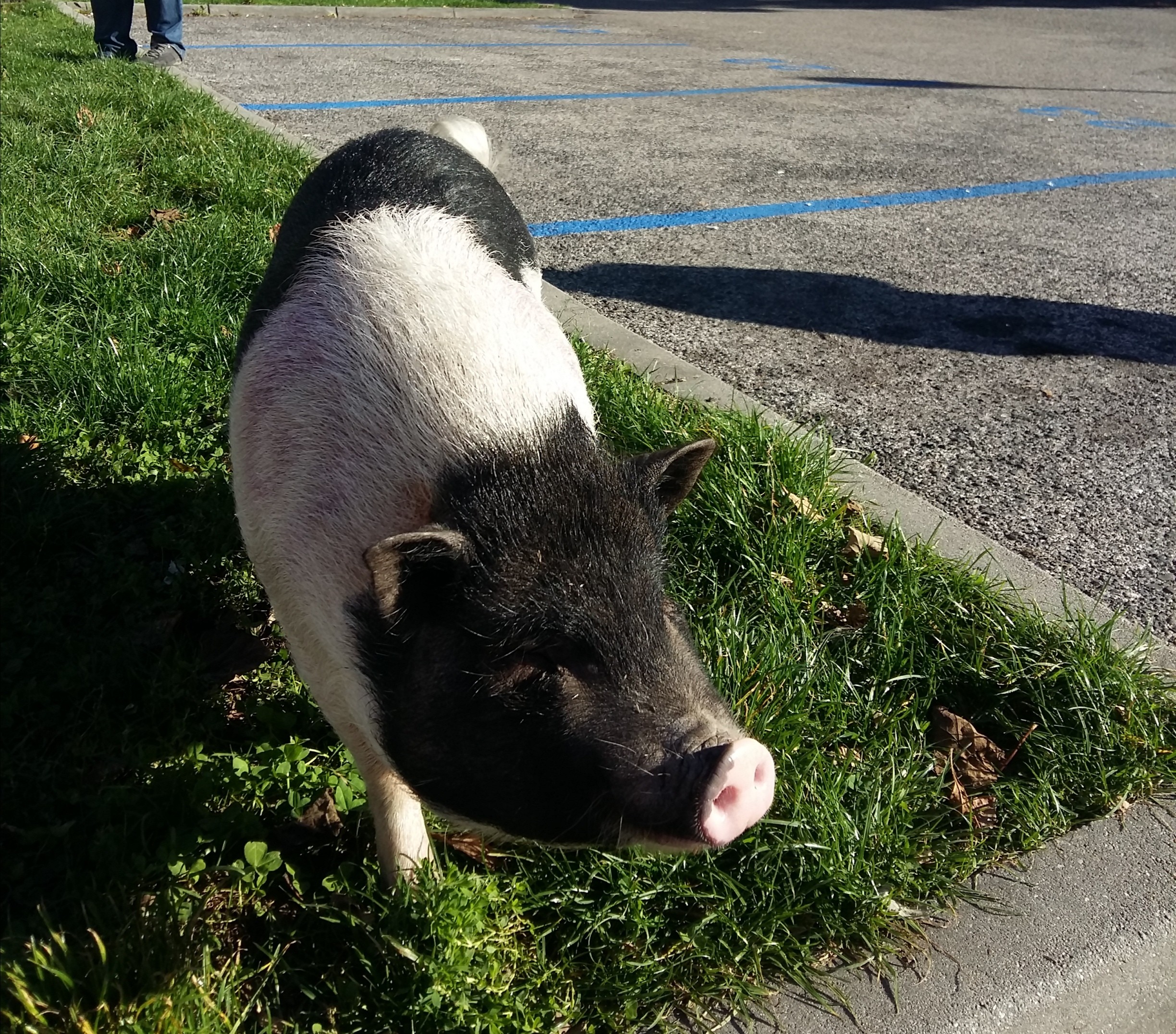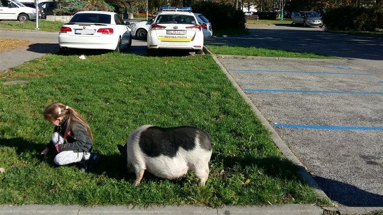 Nestáva sa často, že na tráve pri parkovisku v Ovsišti vidíte samostatne sa „venčiace“ dobre živené prasiatko.