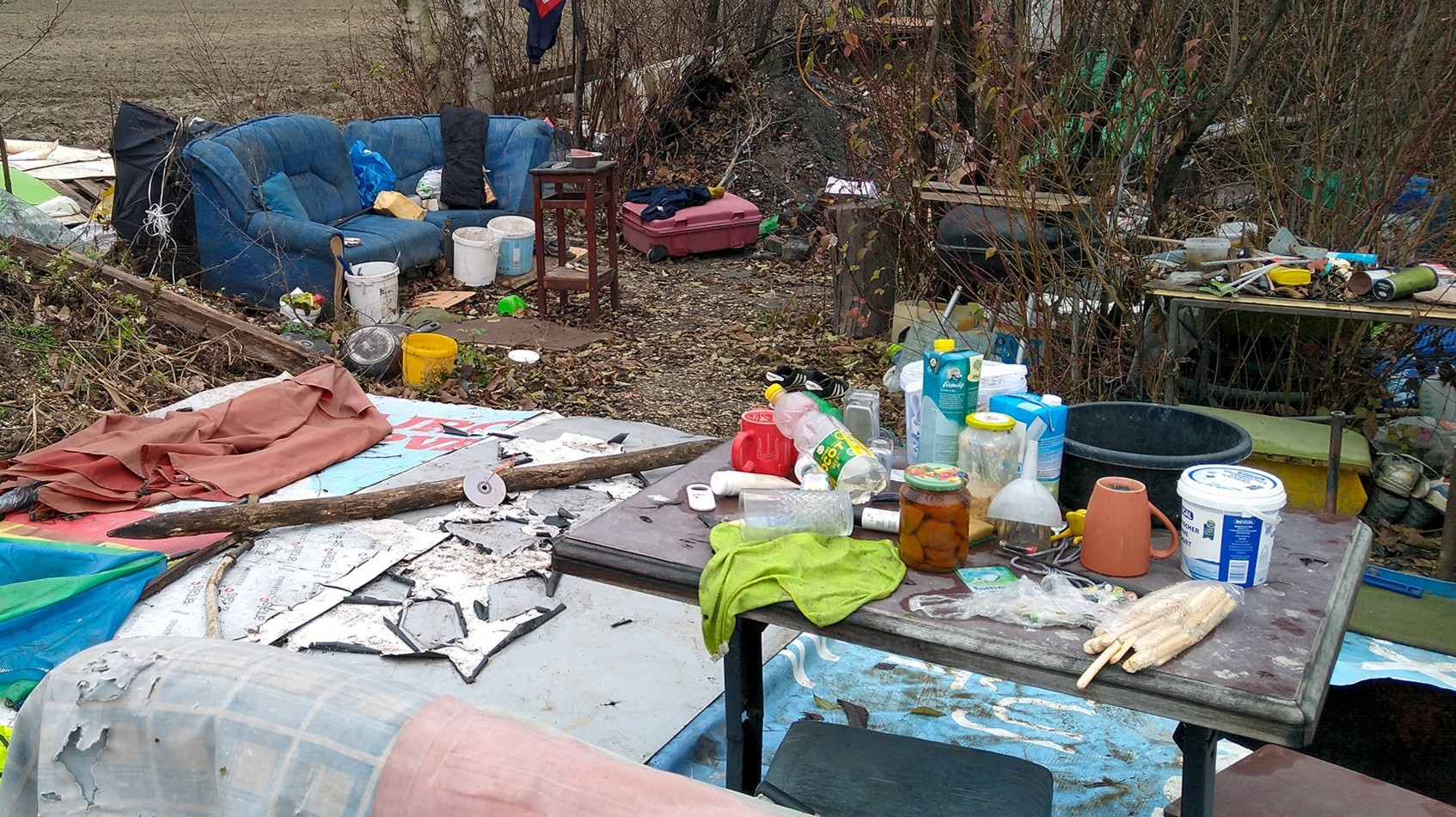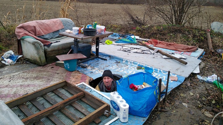 „Viem, vyzerá to tu hrozne, veľa vecí by som mal popáliť, nebýval tu taký neporiadok,“ hovorí Ján a spomína, že sem prišli v noci mladíci z okolia, demolovali veci, hádzali po ňom kamene. Aj z tohto dôvodu sme sa rozhodli neuvádzať presnú lokalitu, kde žije. Nielen títo výrastkovia však prispeli k tomu, čo prežíva. Zima akoby človeka paralyzovala, prestáva byť schopný sebazáchrany. „Musíte trpieť,“ hovorím mu. „Trocha,“ odpovie potichu. Je smutné, aký je tento človek zabudnutý. Neirituje obyvateľov sídliska, neruší ich svojou prítomnosťou, je na takej periférií Bratislavy, že ho netreba urgentne riešiť, takže ani návštevy zo sociálneho oddelenia sa sem nehrnú. Nečudo, pole je ako blato, ťažko sem prejsť. Pracovníci Vagusu sem za ním občas prídu, donesú kávu a čaj..