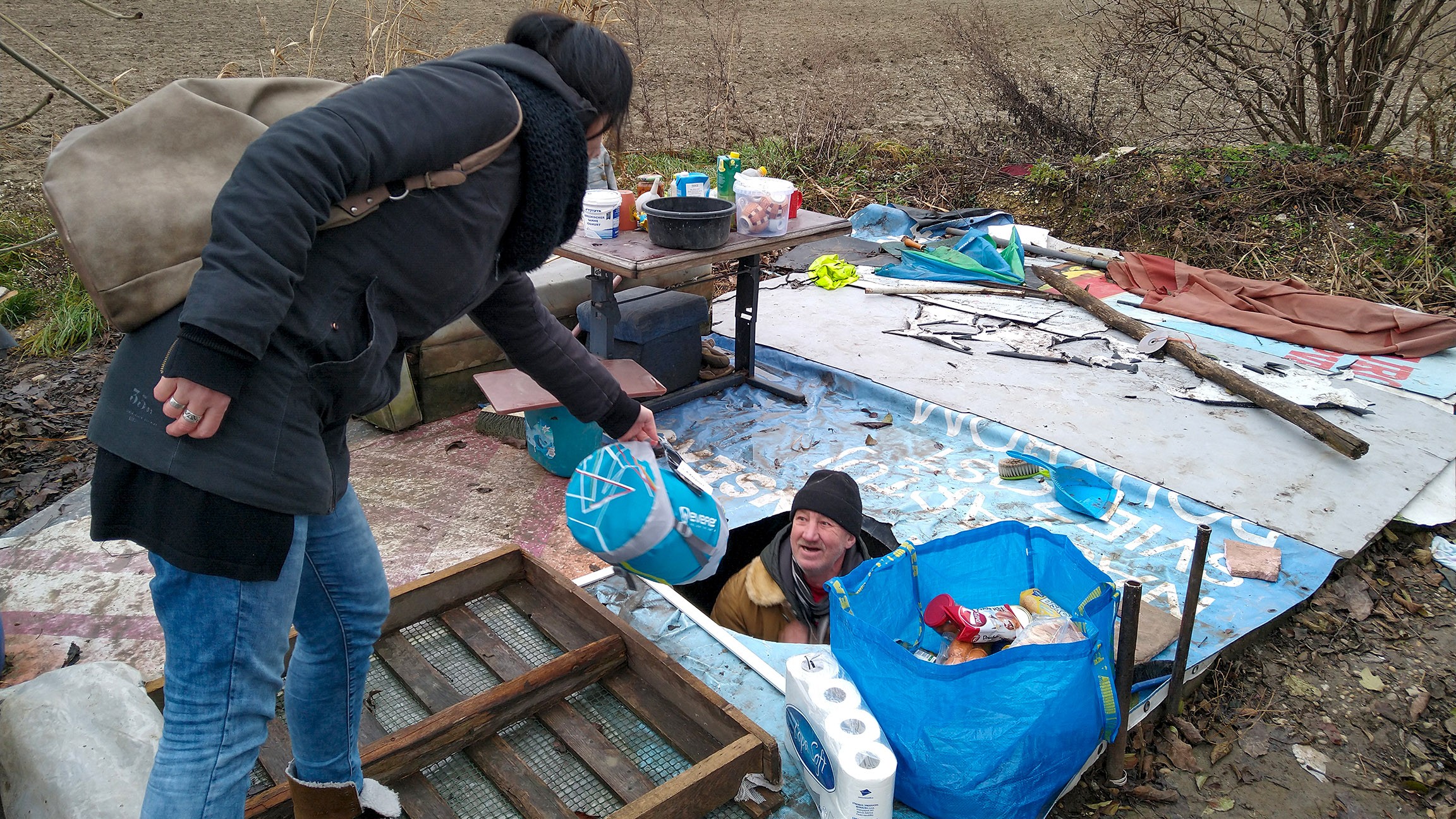 Ján „prežíva“ už ôsmu zimu v starej nádrži na vodu, uprostred poľa. Prišli sme za ním a priniesli mu dva spacie vaky a nejaké trvanlivé potraviny. Vonku boli 2 stupne. Bolo strašné sledovať, ako sa počas nášho rozhovoru kontinuálne triasol od zimy a my sme pochopili, že spacáky a jedlo sú síce pekné gesto, ale tento človek potrebuje najmä miesto, kde by mu bolo teplo.