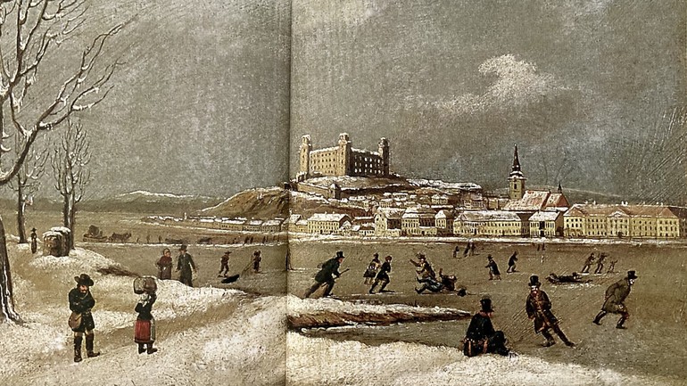 (in, úvodný obrázok , Zamrznutý Dunaj, maľba okolo roku 1920)