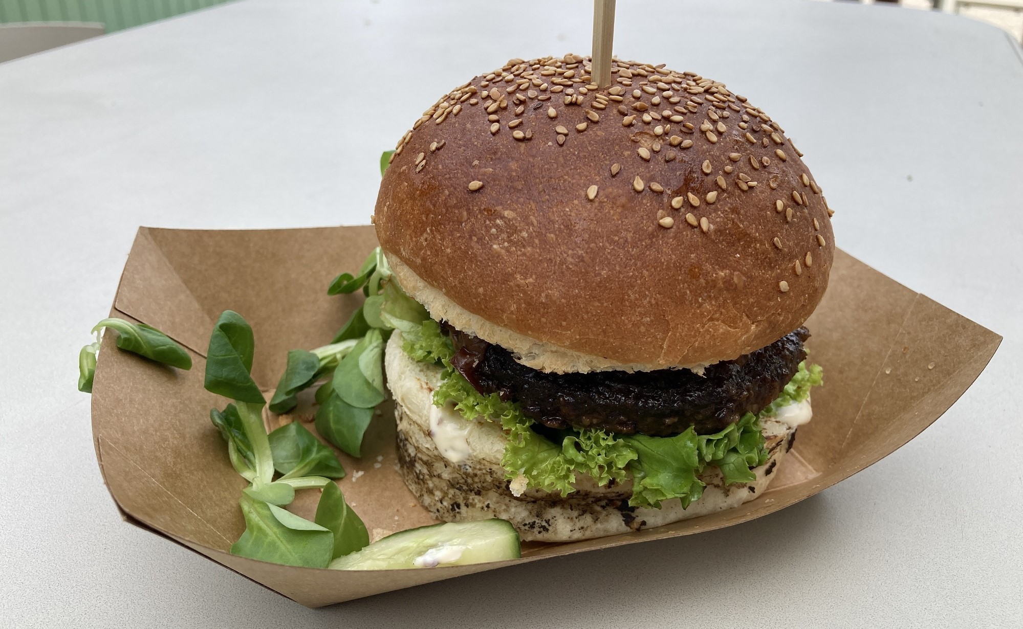 Otestovali sme aj hovädzí burger (7,90 €). Žemľa bola dobrá, burgrová, nejavila známky rozmočenia ani po niekoľkých minútach, a mäsko chutné. Omáčky, ktorá mu dodáva šťavnatosť, sa nám však žiadalo trochu pridať.