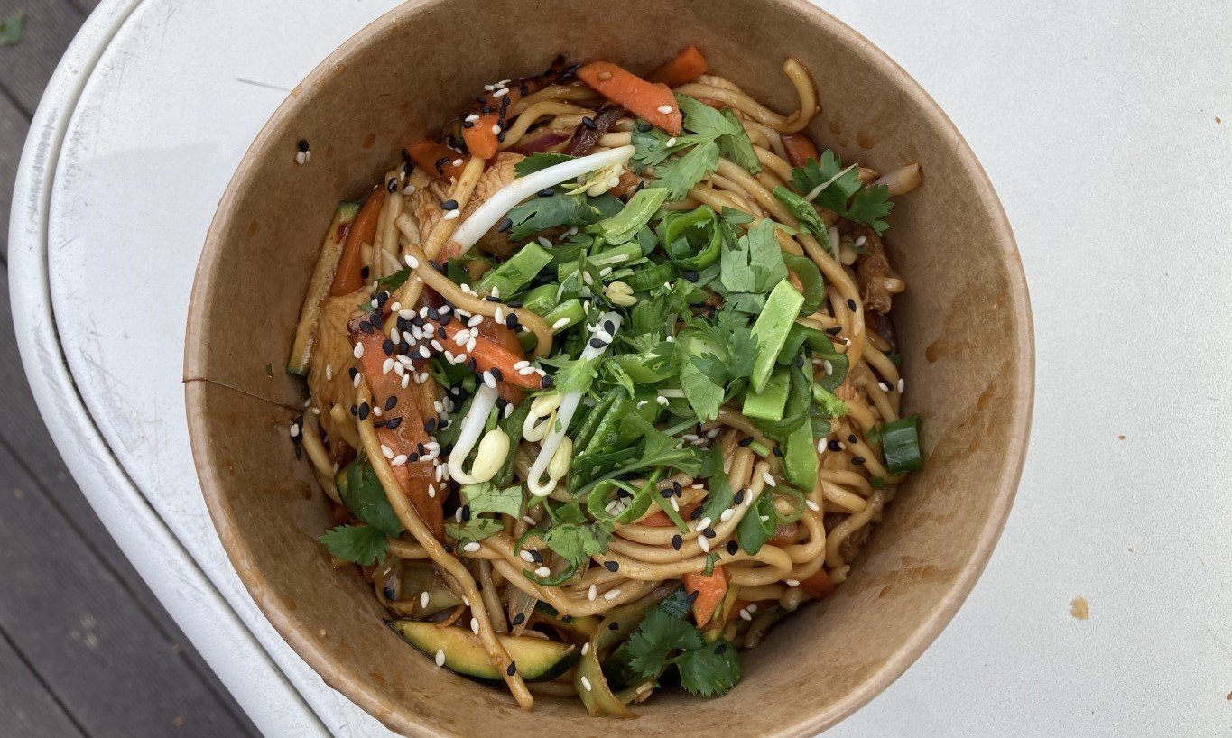 Výborný bol tiež pikantný thajský vývar Tom yum (2,99 €) s citrónovou trávou, zázvorom, kokosovým mliekom, sklenenými rezancami, shitake, hlivou a sójovými klíčkami, rovnako Teriyaki rezance s kuracím mäsom (7,49 €). Boli skvelé, dobre dochutené a veľkosť porcie dostatočná.