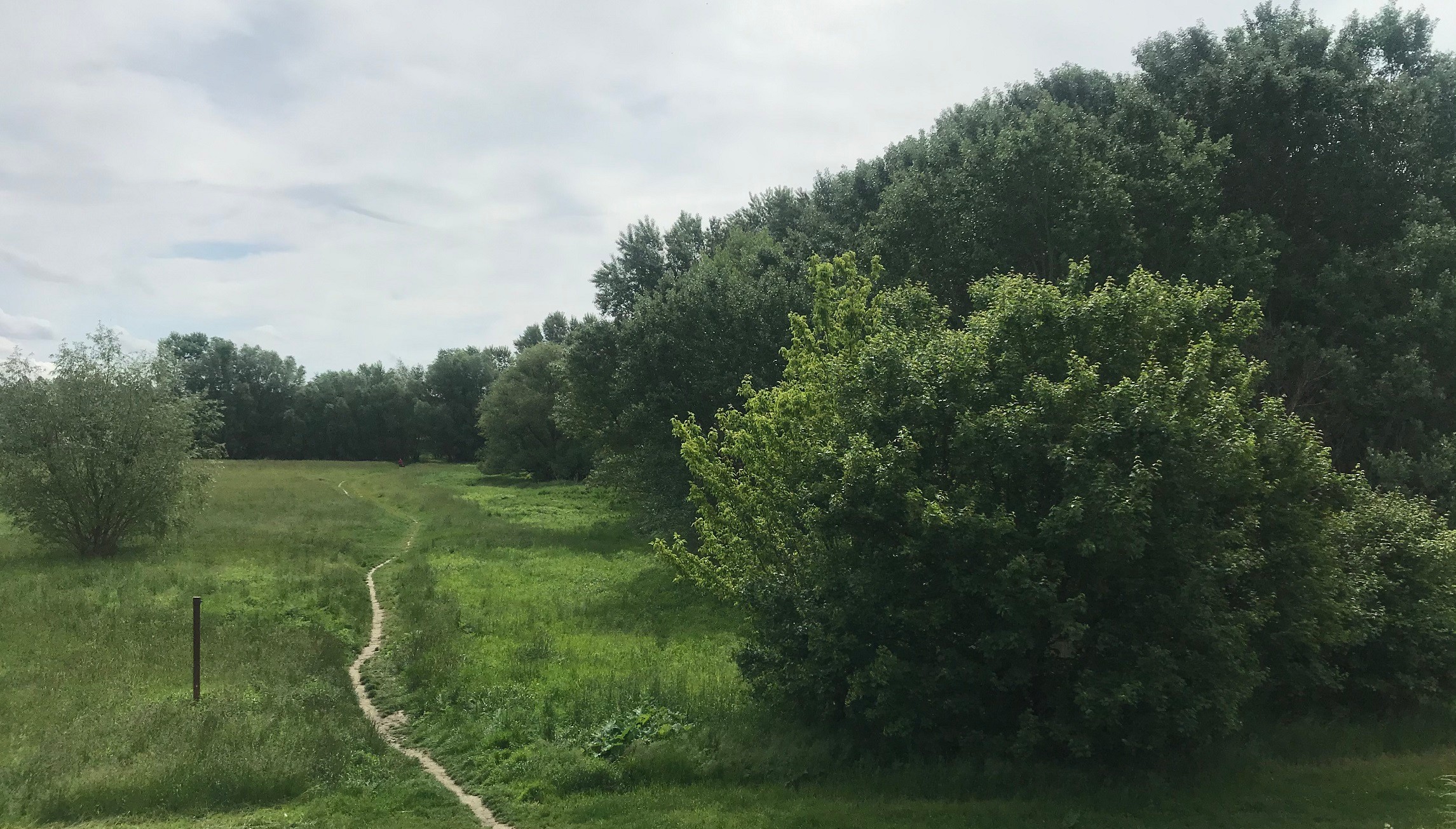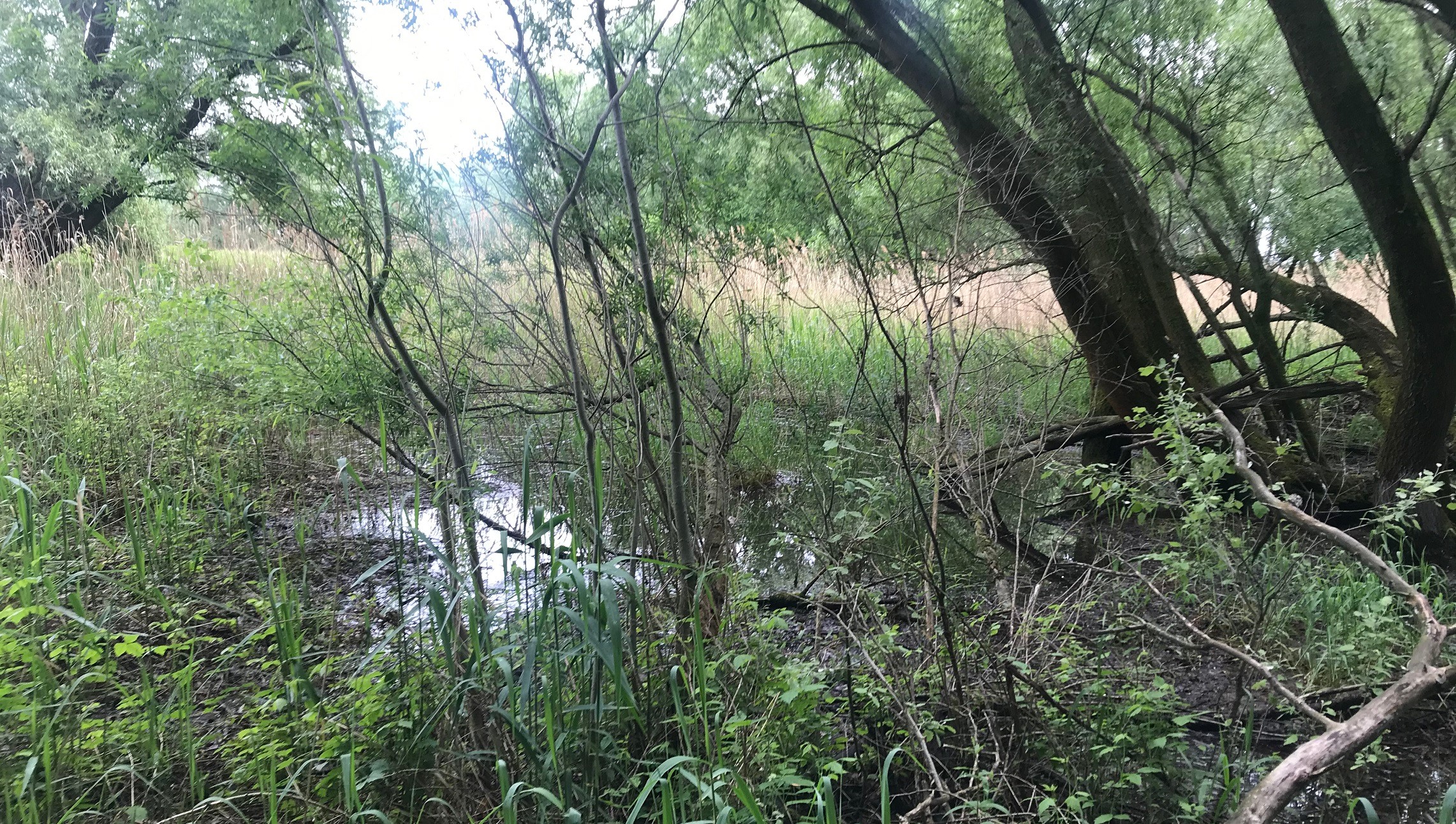 V petržalskom Ovsišti za Ekonomickou univerzitou už jedna lokalita svieti načerveno. A tak sme začali tam. Prechádzame hrádzu presne na mieste, kde pod ňou neďaleko jazdiarne parkujú autá. Linda ukáže na les vpravo a mne sa nechce veriť, že v ňom môže byť nejaká mokraď. Cestu nepozná ani Linda, ktorá smeruje k tomuto liahnisku prvý raz, a tak sa brodíme cez žihľavu. „V Pečnianskom lese je to na niektorých miestach oveľa horšie. Tam je to také zarastené, žeby ste potrebovali aj mačetu,“ hovorí, keď konštatujem, že som si mala zobrať gumáky.