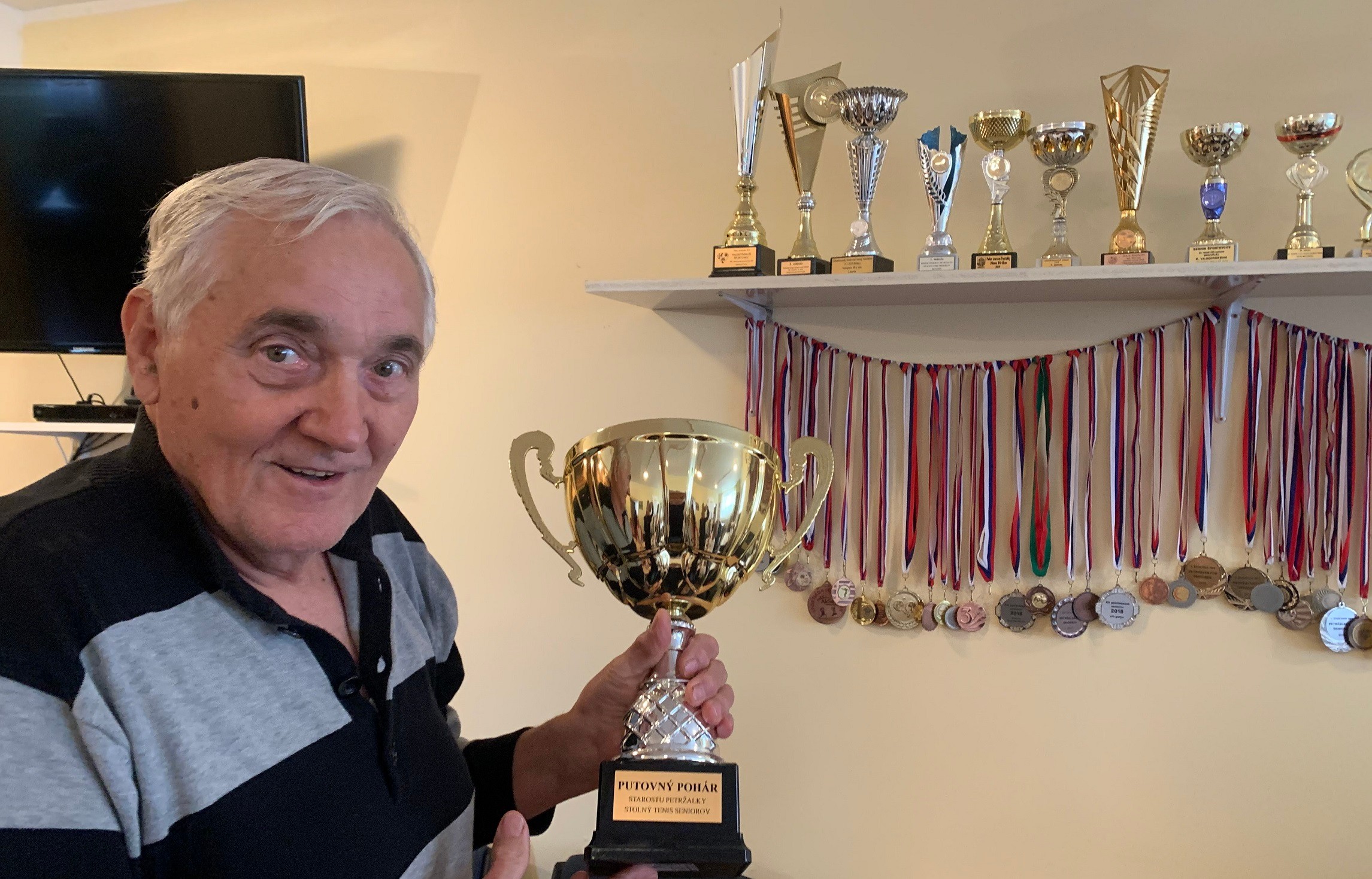 Väčšina pohárov a všetky medaily vystavené v centre patria pánovi Ferkovi Hajkovi (83). Kedysi hrával futbal a hokej, ale v roku 2013 keď mu po operácii zaviedli tri bajpasy, mu lekár zakázal kontaktné športy. „Tak som ako 75-ročný začal so stolným tenisom. A najskôr som všetko prehrával,“ smeje sa.