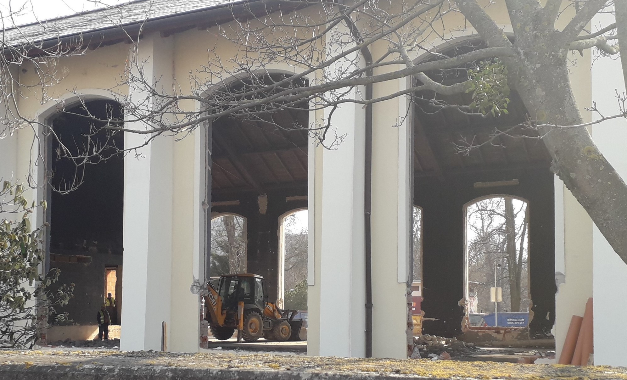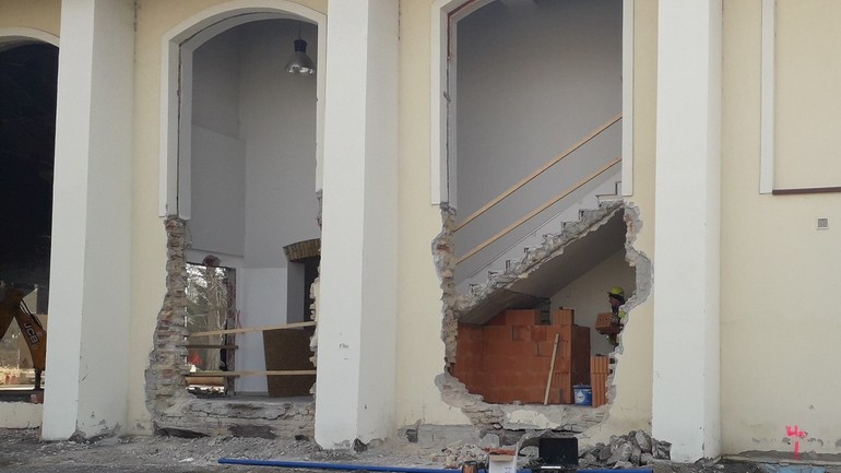 Práce sa rozbehli vo veľkom, keď prechádzame okolo, už z diaľky počujeme hluk zbíjačky, spoza plota vidíme vybúrané vnútorné priestory, aj stavebný stroj rozbíjajúci betón.