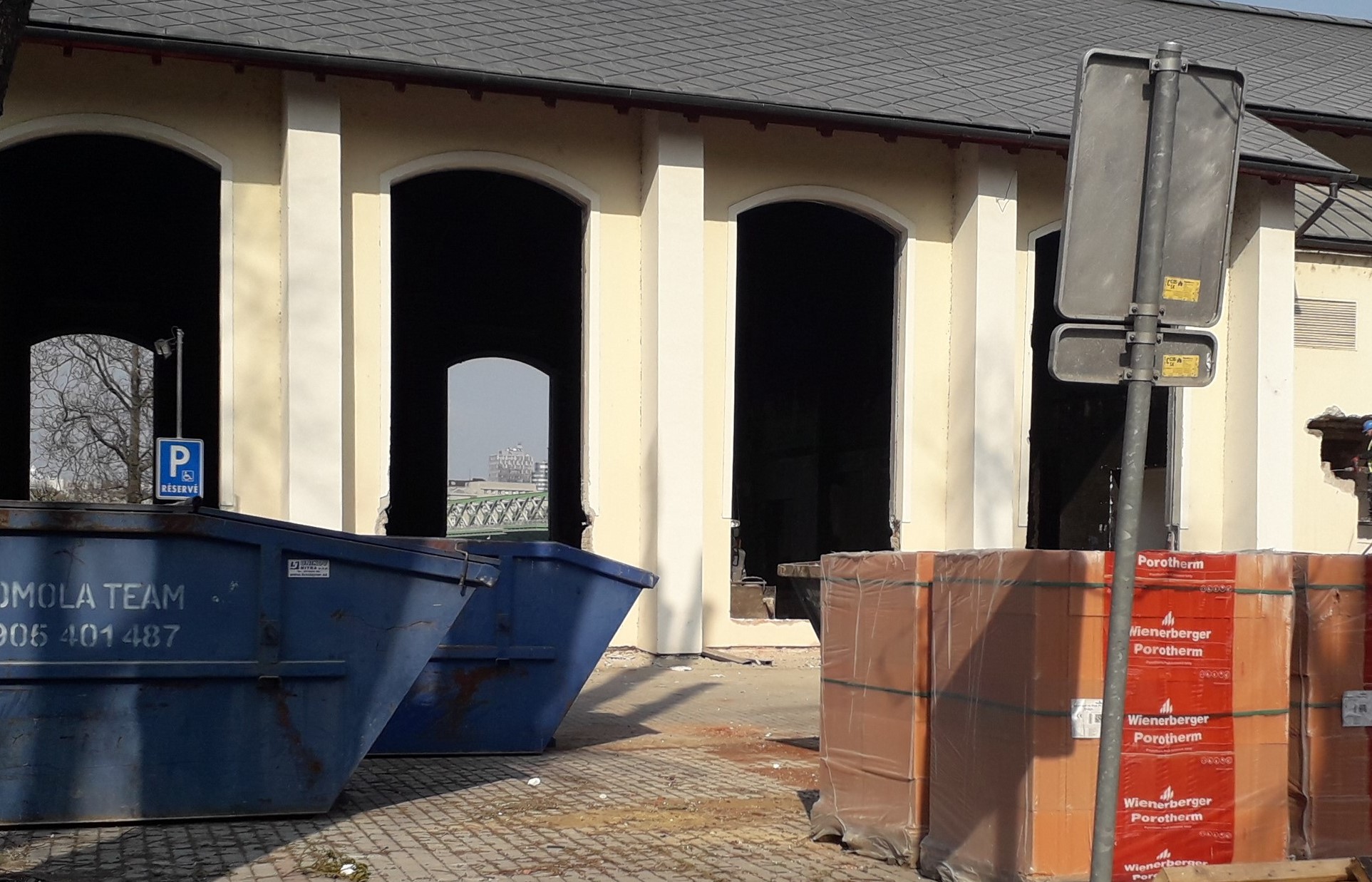 Vnútrajšok budovy je vybúraný, vnútri vidieť aj stavebný mechanizmus.
