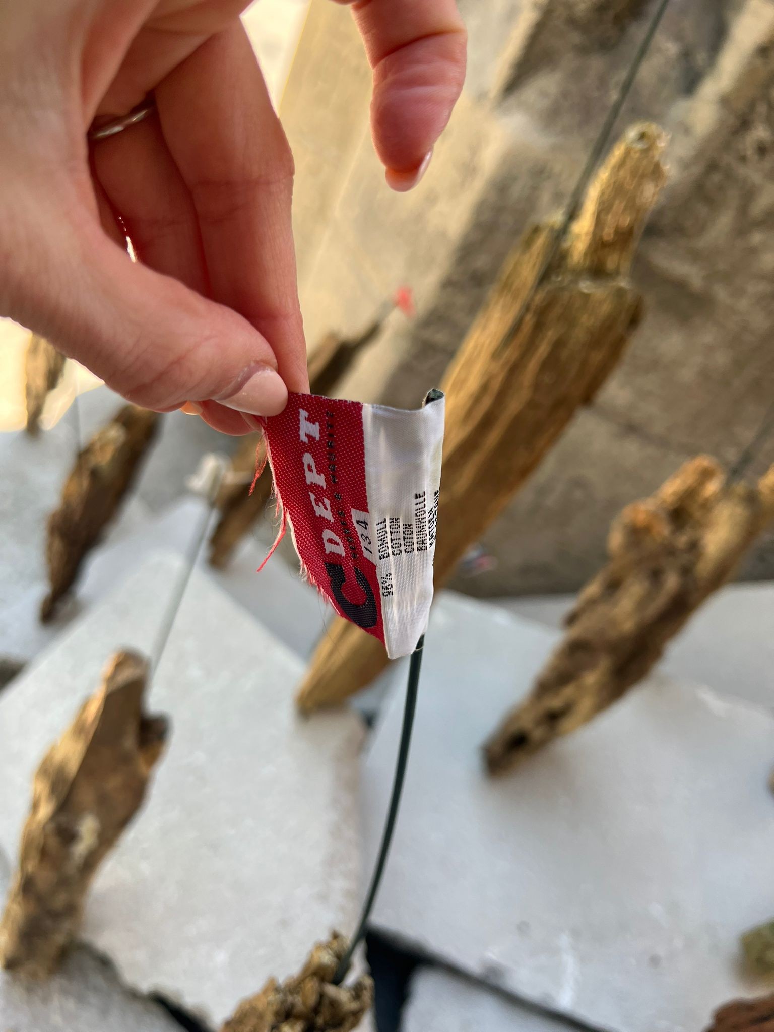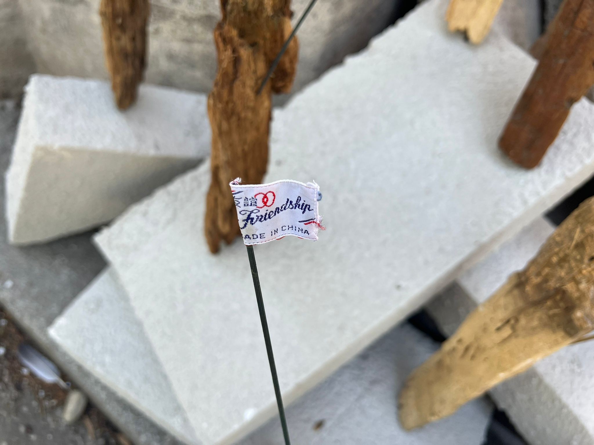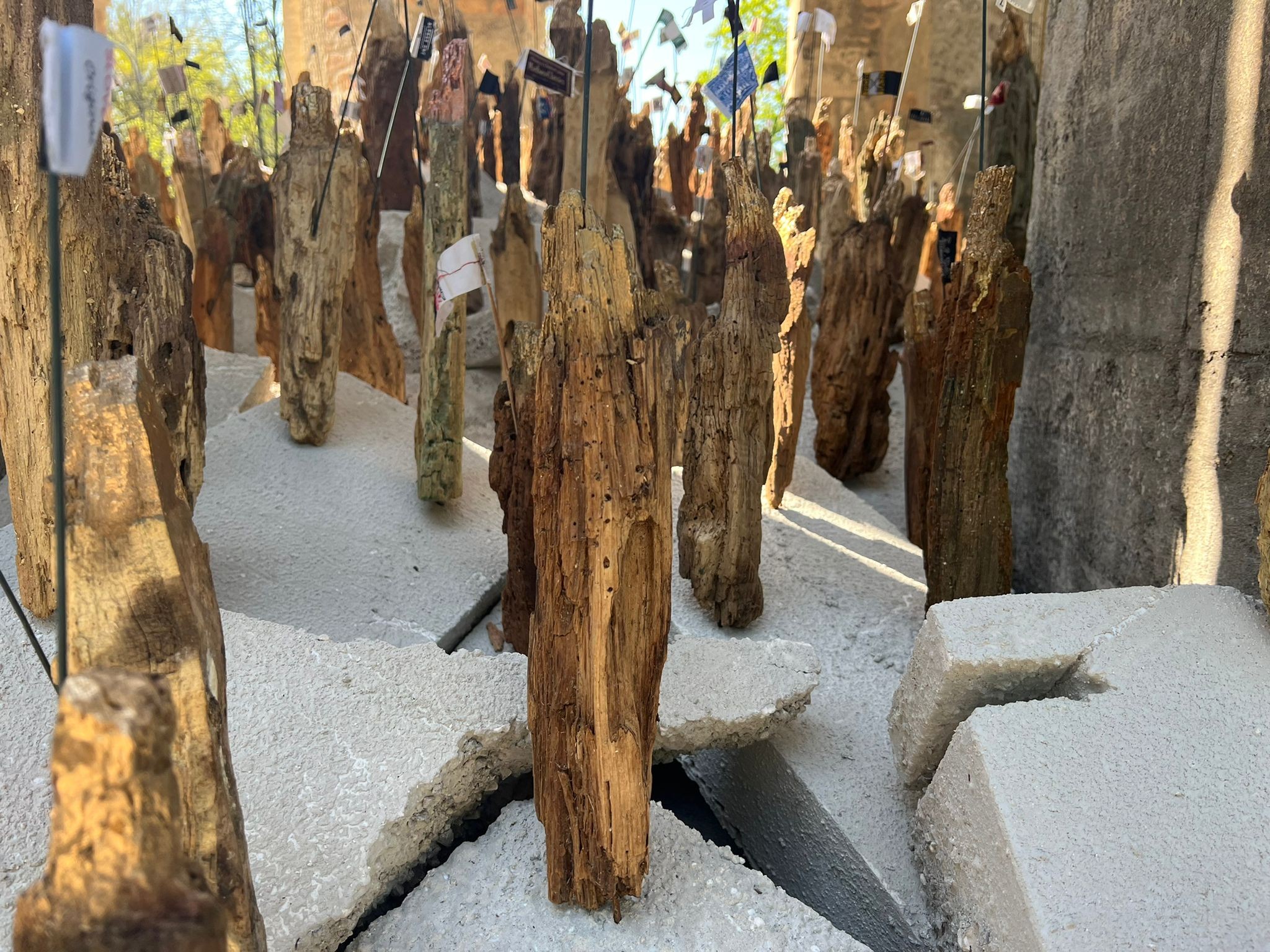 Inštalácia je zložená z kvádrov, drevených paličiek a vlajočiek, všetko ide o symboly