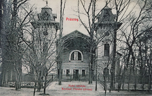 „Iniciátorom bol vtedajší riaditeľ Mestského divadla Stöger. Budovu postavili podľa vzoru talianskych amfiteátrov. V Aréne hrávali veselohry, opery, operety, baletné predstavenia pre deti a dospelých, usporadúvali koncerty a estrádne večery od jari do jesene, každú nedeľu a vo sviatky,“ píše Ján Čomaj v knihe Petržalka Engerau – Ligetfalu. „Pravdepodobne už o dva roky nato ju vystriedalo nové drevené otvorené amfiteátrum s kapacitou 3000 miest, kaviarňou a reštauráciou, slúžiace občanom mesta takmer 70 rokov,“ píše sa na stránke www.theatre-architecture.eu.