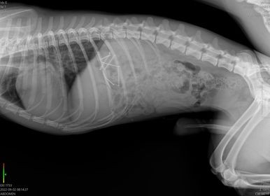 Na RTG snímke vidno špendlíky v tráviacej súsatve psa.