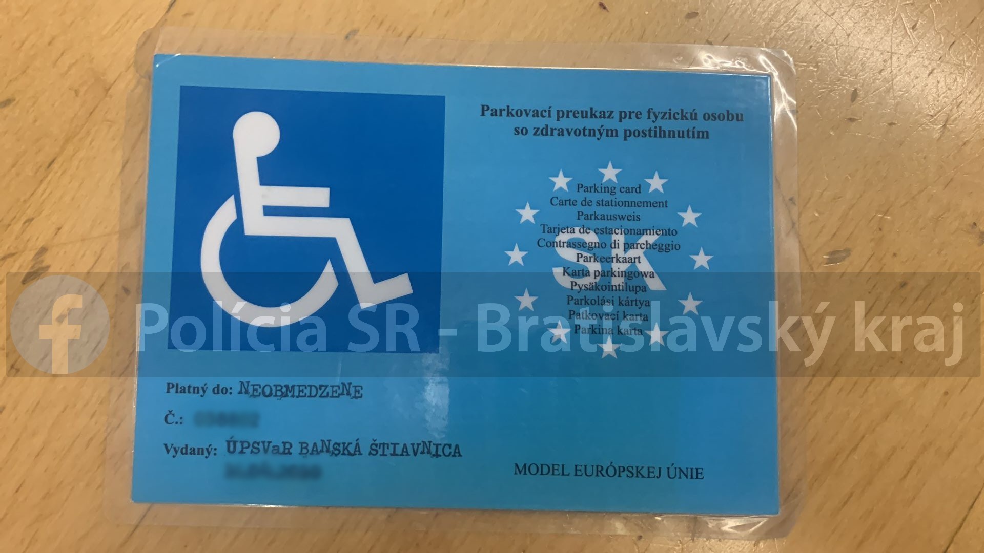 Uplynulú sobotu (24.09.2022) v blízkosti obchodného centra na Einsteinovej ulici v Bratislave dopravní policajti kontrolovali vodiča motorového vozidla zn. Land Rover, ktorý stál so svojím vozidlom na vyhradenom parkovacom mieste pre zdravotne ťažko postihnuté osoby. Počas kontroly policajtom predložil aj parkovací preukaz pre fyzickú osobu so zdravotným postihnutím. "Policajtom na preukaze ŤZP neunikli odchýlky, pre ktoré vzniklo podozrenie, že ide o falzifikát," ozrejmila polícia.