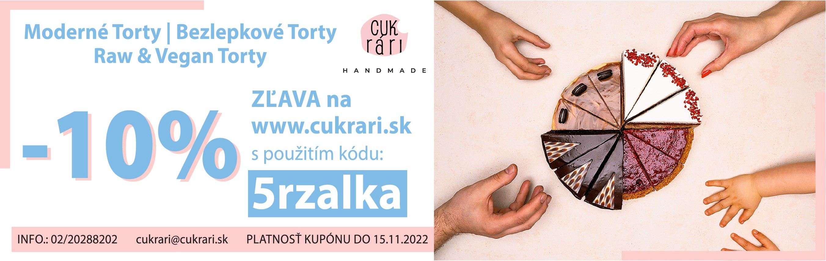 Na záver sme si pre vás pripravili malé prekvapenie: až do 15.11. môžete využiť zľavu 10% na nákup na webe www.cukrari.sk alebo priamo na predajni v Petržalke. Stačí pri objednaní zadať zľavový kód 5rzalka alebo ukázať tento zľavový kupón priamo na predajni.