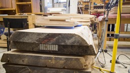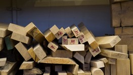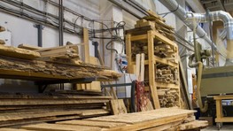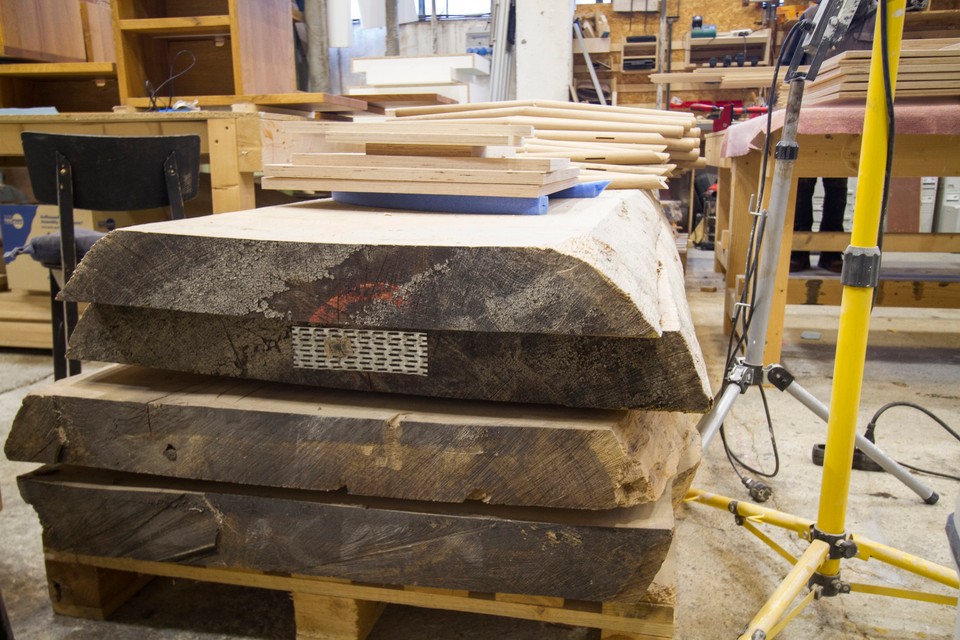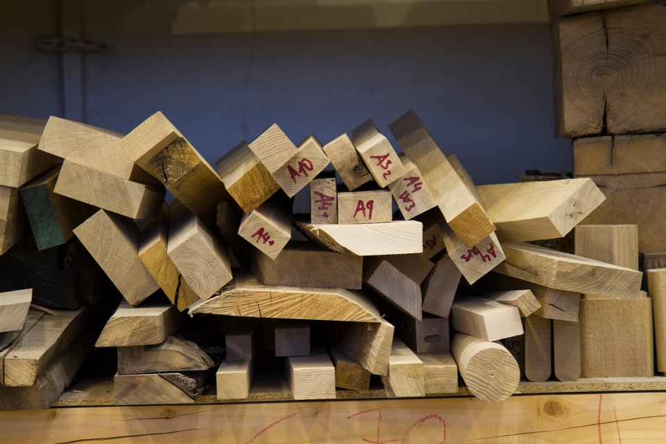 „Toto sú fošne v surovom stave, z ktorých bude stôl,“ ukazuje nám počas prehliadky. „Tu sú zas budúce dubové madlá, ktoré budú pri výťahových šachtách, tu sedenie a police do jednej kaviarne a toto je dubový parapet na okno rodinného domu.“