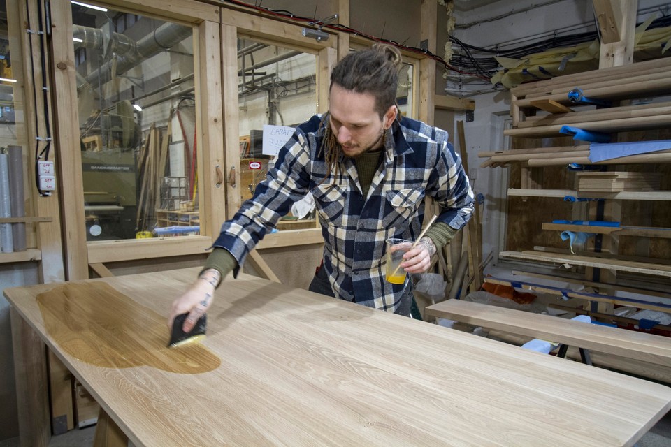 V lakovni, v ktorej sa nelakuje. Používajú tvrdý voskový olej. Je viac eko a pri poškodení nábytku sa dá lokálne opraviť.