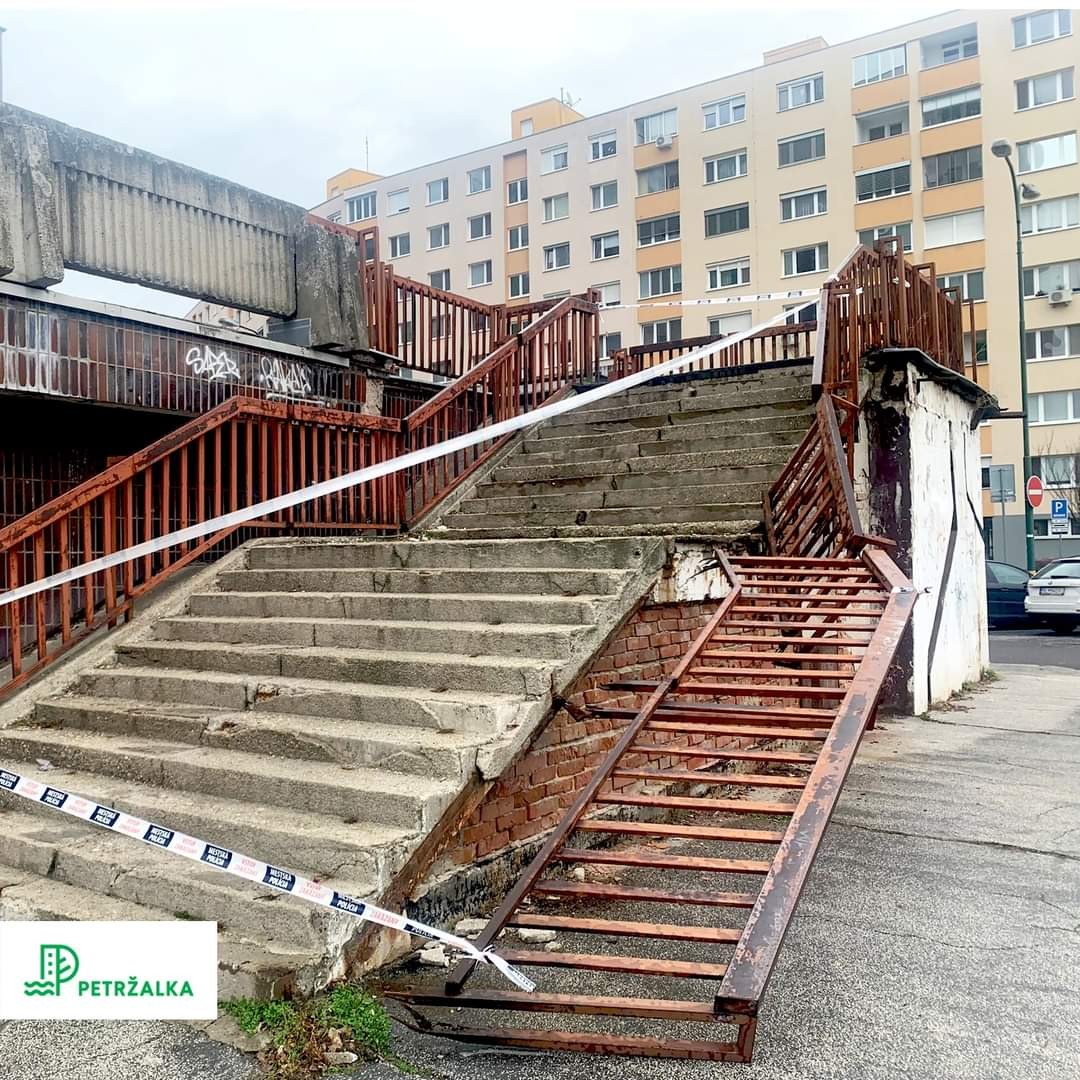 Zhrňme si aktuálny stav: Petržalské terasy sa nám rúcajú pred očami. Minulý rok na jar spadla časť betónového múru na Holíčskej, vzápätí zábradlie schodiska na Beňadickej, nedávno zábradlie schodiska na Jasovskej 12. Rovnaký, minimálne 800-kilogramový múr ako na Holíčskej, sa začína nakláňať na Šustekovej 15 nad Očnou optikou. Mimochodom, trúfate si ešte využívať priľahlé schody? Mestská časť tiež apeluje, aby ste obmedzili pohyb v okolí úseku terasy na Blagoevovej, ktorej schodisko pre havarijný stav tiež zabezpečila a upozorňuje aj na havarijný stav schodiska i terasy na Jasovskej 2, ktorá patrí magistrátu.