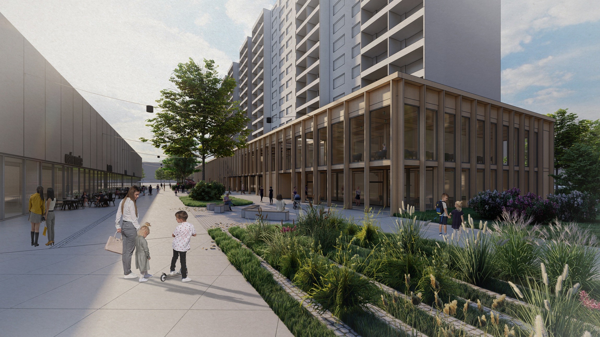 Vďaka parkovaciemu domu s občianskou vybavenosťou (druhý je navrhnutý pred terasou na Vlasteneckom námestí) by autá uvoľnili verejný priestor. Zostal by len zjazdný chodník pre obsluhu prevádzok alebo potreby obyvateľov v prípade sťahovania. Autá by nahradilo pásmo zelene a pešia zóna. Do domov by sa vstupovalo na prízemí, kde by boli ukryté aj odpadové nádoby.